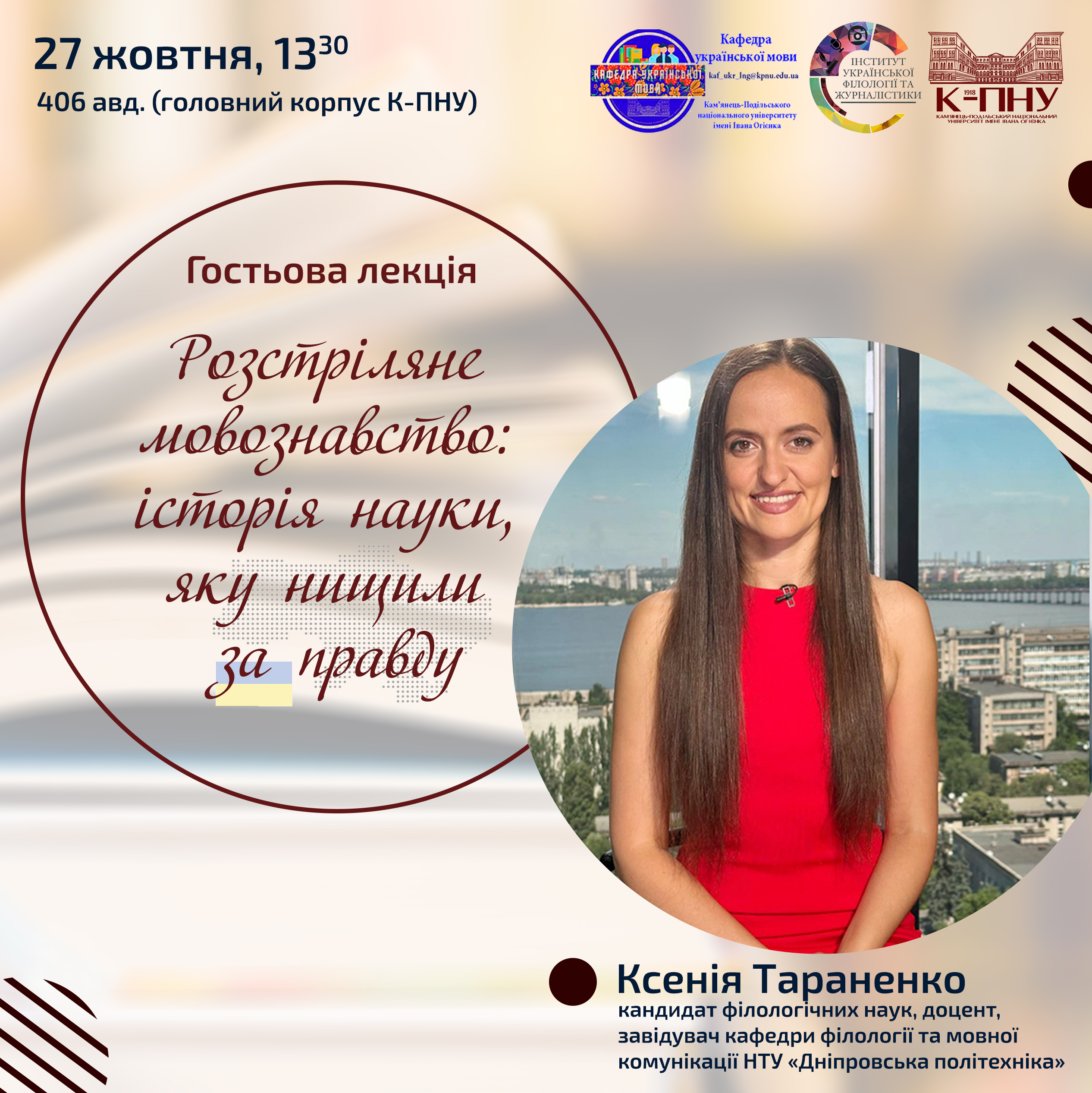 У межах проведення тижня навчально-наукового інституту української філології та журналістики 27 жовтня о 13:30 (406 авд., головний корпус К-ПНУ) відбудеться гостьова лекція Ксенії Тараненко, кандидата філологічних наук, доцента, завідувача кафедри філології та мовної комунікації НТУ «Дніпровська політехніка», з теми «Розстріляне мовознавство: історія науки, яку нищили за правду».