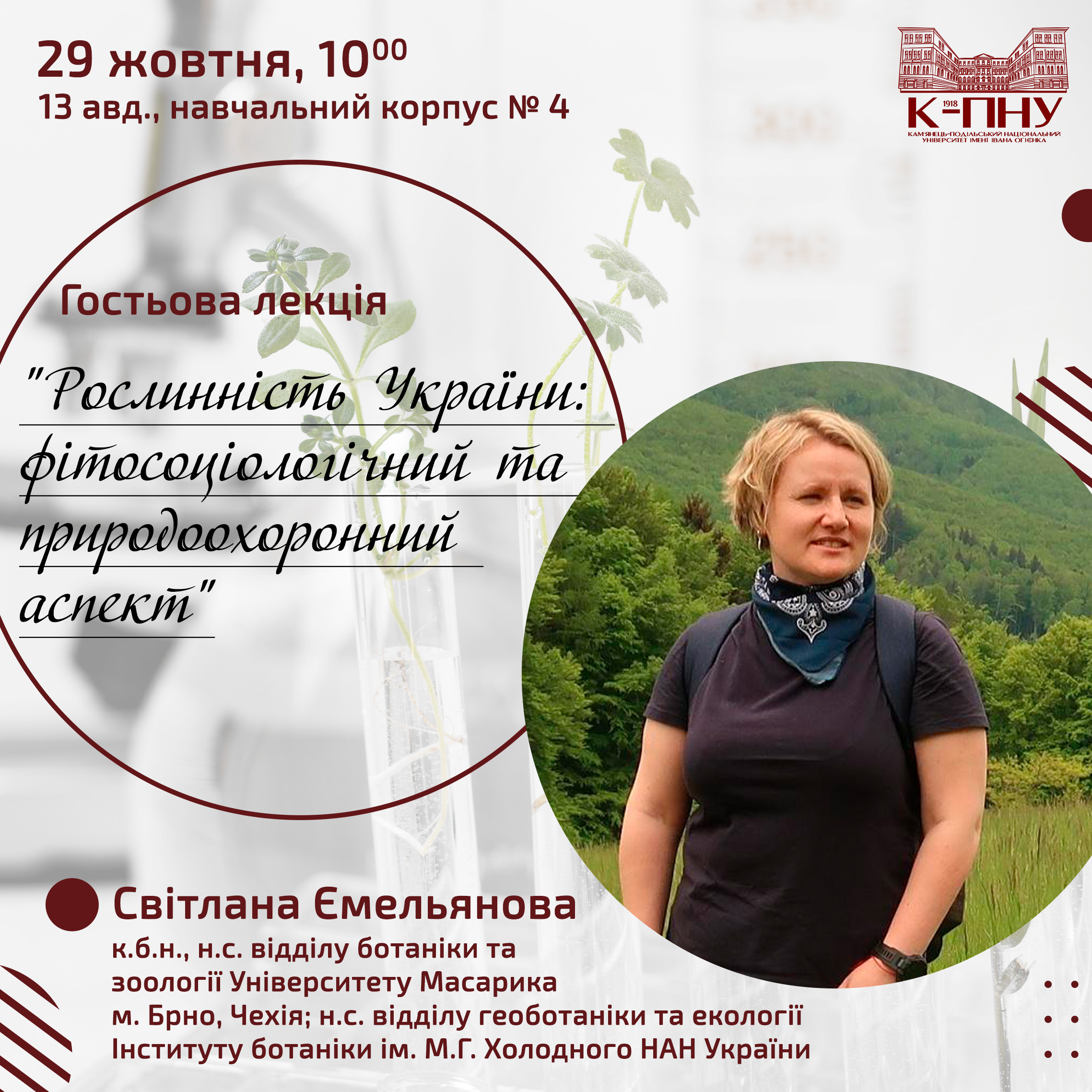 Запрошуємо на гостьову лекцію Світлани Ємельянової, кандидата біологічних наук, наукового співробітника відділу ботаніки та зоології Університету Масарика (м. Брно, Чехія), наукового співробітника відділу геоботаніки та екології Інституту ботаніки імені М. Г. Холодного НАН України, з теми «Рослинність України: фітосоціологічний та природоохоронний аспект», яка відбудеться 29 жовтня о 10:00 (13 авд., навчальний корпус №4).