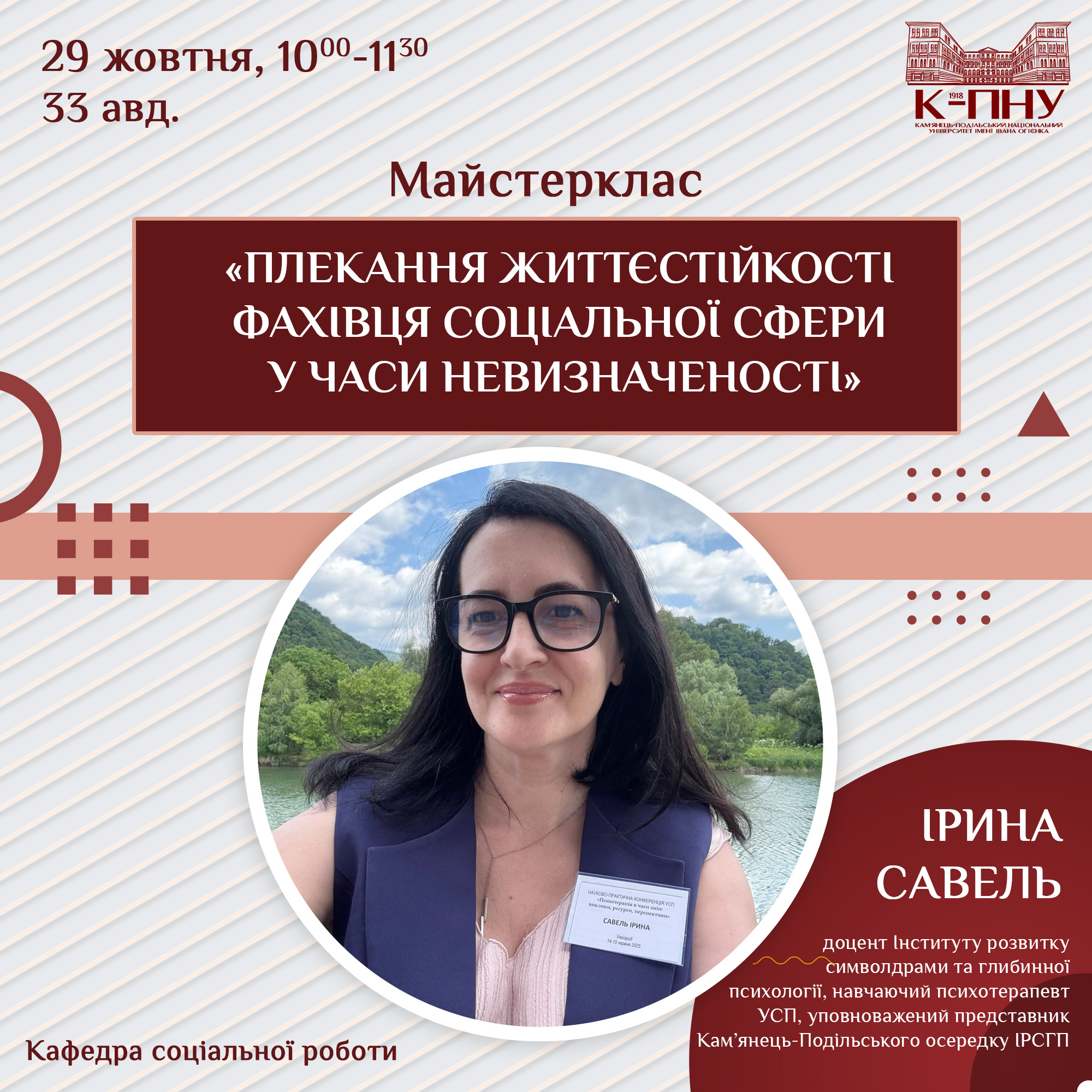 29 жовтня о 10:00 (33 авд.) відбудеться майстерклас від Ірини Савель, доцента Інституту розвитку символдрами та глибинної психології, навчаючий психотерапевт УСП, уповноважений представник Кам’янець-Подільського осередку ІРСГП, з теми «Плекання життєстійкості фахівця соціальної сфери у часи невизначеності».