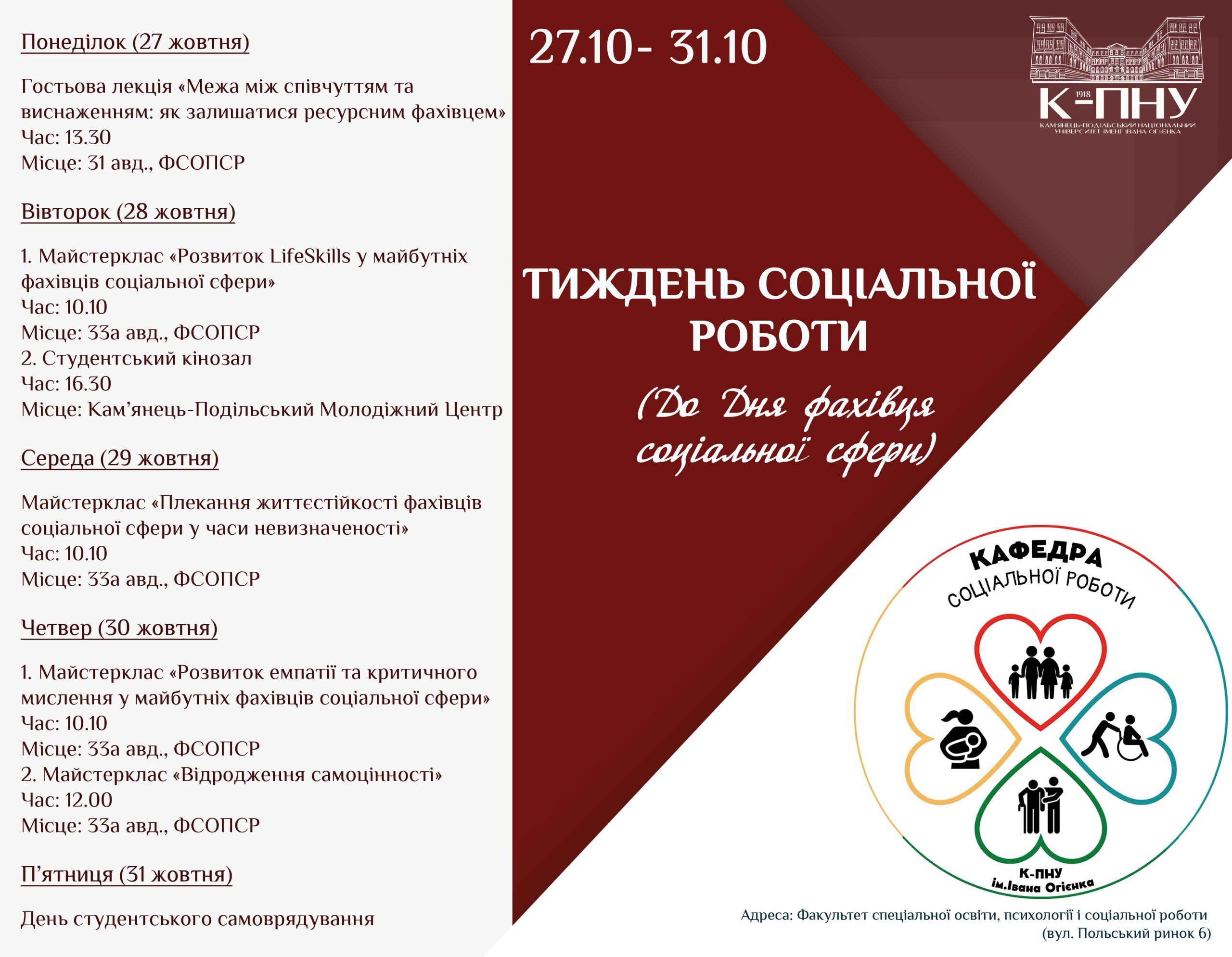До Дня фахівця соціальної сфери з 27 до 31 жовтня в Кам’янець-Подільському національному університеті імені Івана Огієнка відбуватиметься тиждень соціальної роботи.