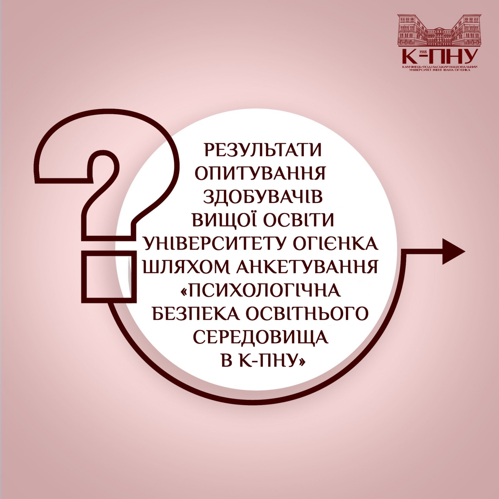 Навчально-методичний центр забезпечення якості освіти К-ПНУ спільно із соціально-психологічною службою К-ПНУ 20-28 лютого 2023 р. провели опитування здобувачів вищої освіти щодо психологічної безпеки освітнього середовища в К-ПНУ, у якому взяли участь 815 здобувачів вищої освіти. Серед опитаних найбільше було здобувачів вищої освіти факультету спеціальної освіти, психології і соціальної роботи – 24% (196 осіб), педагогічного факультету – 21,5% (175 осіб), факультету іноземної філології – 14,1% (115 осіб) та історичного факультету – 12,5% (102 особи) тощо. Серед респондентів – здобувачі вищої освіти освітніх ступенів бакалавра – 85,9% (700 осіб), магістра – 12,5% (102 особи), доктора філософії – 1,6% (13 осіб), з яких – 91,3% (744 особи) денної форми здобуття вищої освіти та 8,7% (71 особа) – заочної форми.