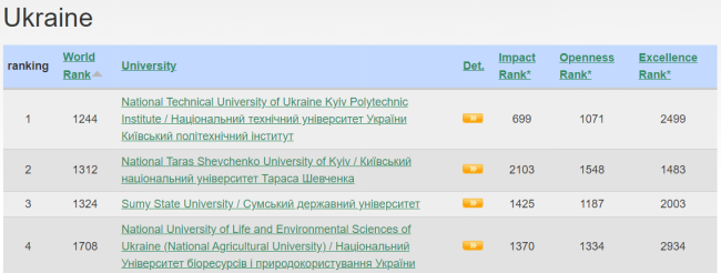 Найбільший міжнародний академічний рейтинг закладів вищої освіти «Webometrics Ranking of World’s Universities» (https://www.webometrics.info/en) періодично презентує незалежне, об’єктивне безкоштовне відкрите наукове дослідження для надання надійної, багатовимірної, актуальної і корисної інформації про ефективність університетів з усього світу.