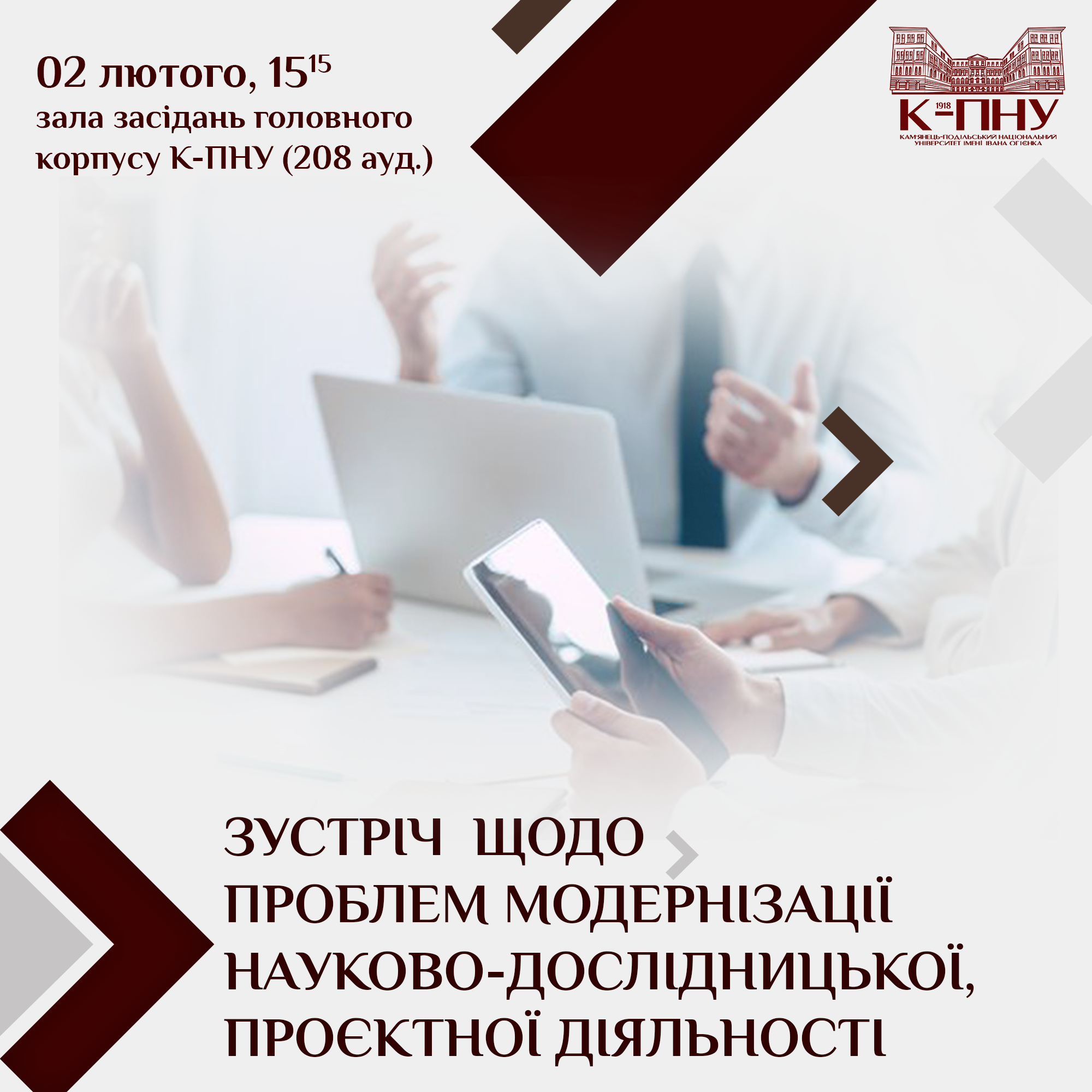 02 лютого  в залі засідань (208 аудиторії)  відбудеться зустріч Наукового товариства студентів, аспірантів та молодих учених зі здобувачами вищої освіти К-ПНУ щодо проблем модернізації науково-дослідницької, проєктної діяльності.