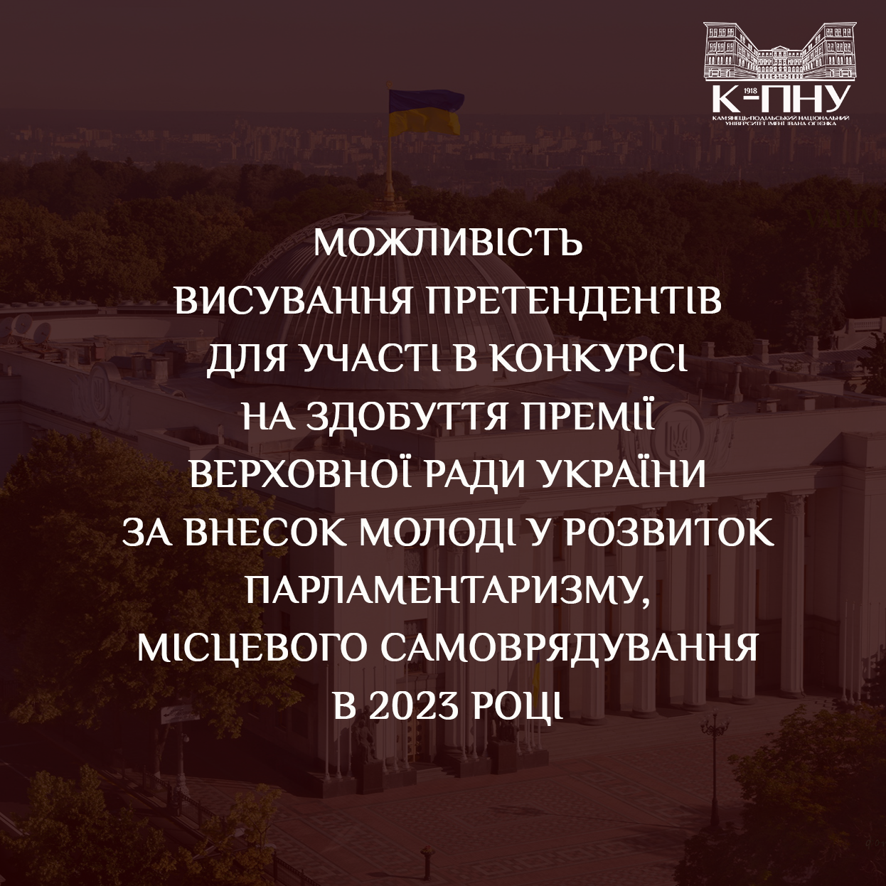 Міністерство освіти і науки України  інформує, що Комітет Верховної Ради України з питань молоді і спорту здійснює прийом документів на здобуття Премії Верховної Ради України за внесок молоді в розвиток парламентаризму, місцевого самоврядування у 2023 році відповідно до Постанови Верховної Ради України від 22 травня 2003 року № 840-IV «Про Премію Верховної Ради України за внесок молоді у розвиток парламентаризму, місцевого самоврядування».