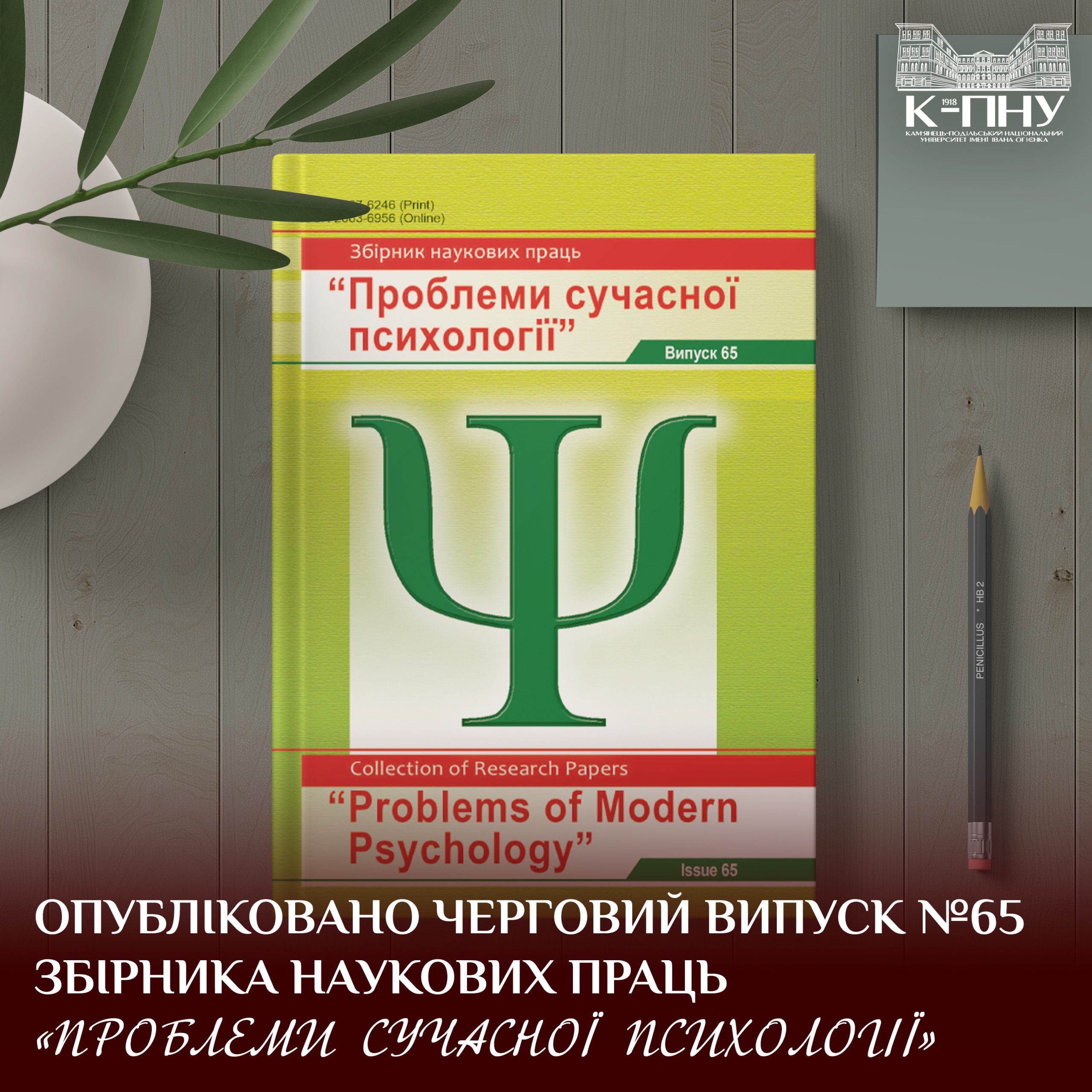 Опубліковано черговий випуск №65 рецензованого видання Збірника наукових праць «Проблеми сучасної психології» Кам’янець-Подільського національного університету імені Івана Огієнка та Інституту психології імені Г.С. Костюка НАПН України, включеного до Переліку наукових фахових видань України, Категорія «Б», психологічні спеціальності – 053 відповідно до наказу Міністерства освіти і науки України від 28.12.2019 року №1643 «Про затвердження рішень Атестаційної колегії Міністерства щодо діяльності спеціалізованих вчених рад від 16 грудня 2019 року та внесення змін до наказів Міністерства освіти і науки України».