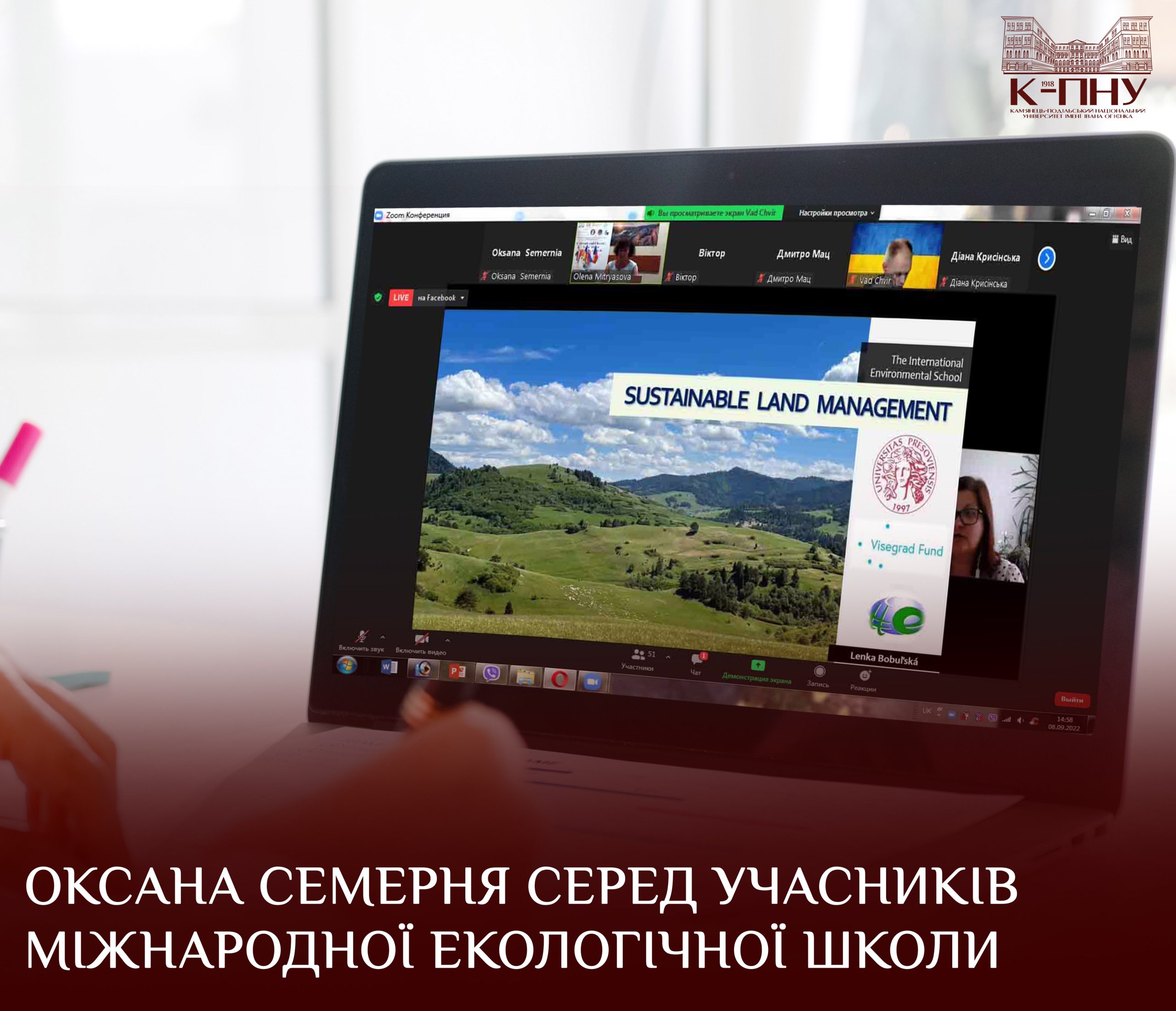 07-08 вересня за участі представників різних університетів та установ країн Вишеградської групи (Польщі, Чехії, Угорщини і Словаччини), України та Східної Європи працювала Міжнародна екологічна школа «Вишеградський та український діалоги щодо зміни клімату та сталого розвитку». Серед учасників зустрічей – доктор педагогічних наук, доцент, доцент кафедри екології Оксана Семерня.