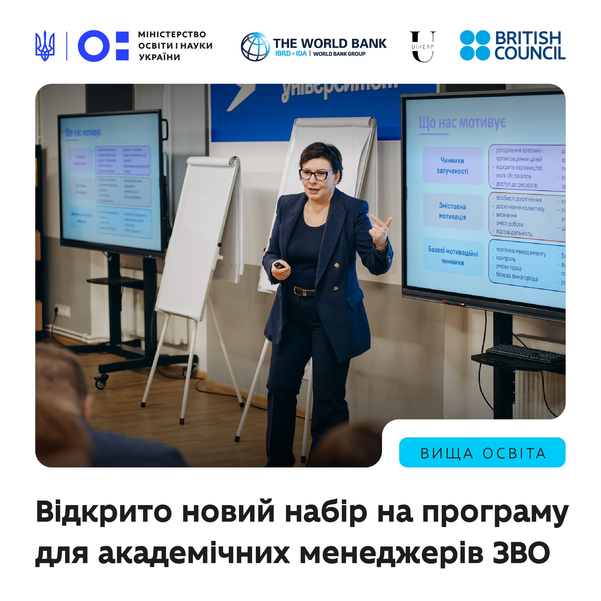 Міністерство освіти і науки України у співпраці з Британською Радою в межах реалізації спільного зі Світовим банком проєкту «Удосконалення вищої освіти в Україні заради результатів» (Ukraine Improving Higher Education for Results Project – UIHERPзапрошує команди державних закладів вищої освіти України, що належать до сфери управління МОН, до участі в Програмі професійного розвитку академічних менеджерів закладів вищої освіти України.