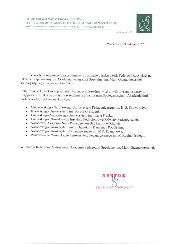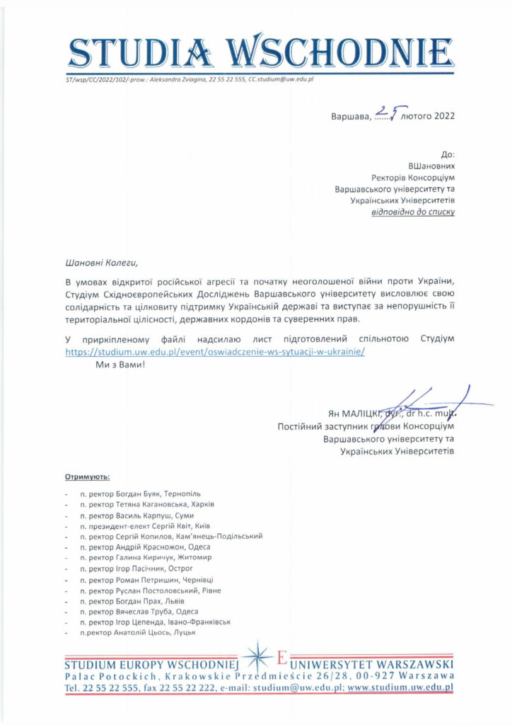 До К-ПНУ надійшов лист солідарності й підтримки від польських колег Центру Східноєвропейських студій Варшавського університету та Академії спеціальної педагогіки ім. Марії Гжегожевської.