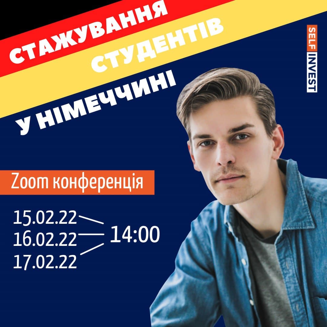 Запрошуємо здобувачів вищої освіти К-ПНУ на зустріч-презентацію “Стажування в Німеччині” з національним представником компанії SELFINVEST Євгеном Рибаковим. Зустрічі відбудуться на платформі Zoom для студентів: