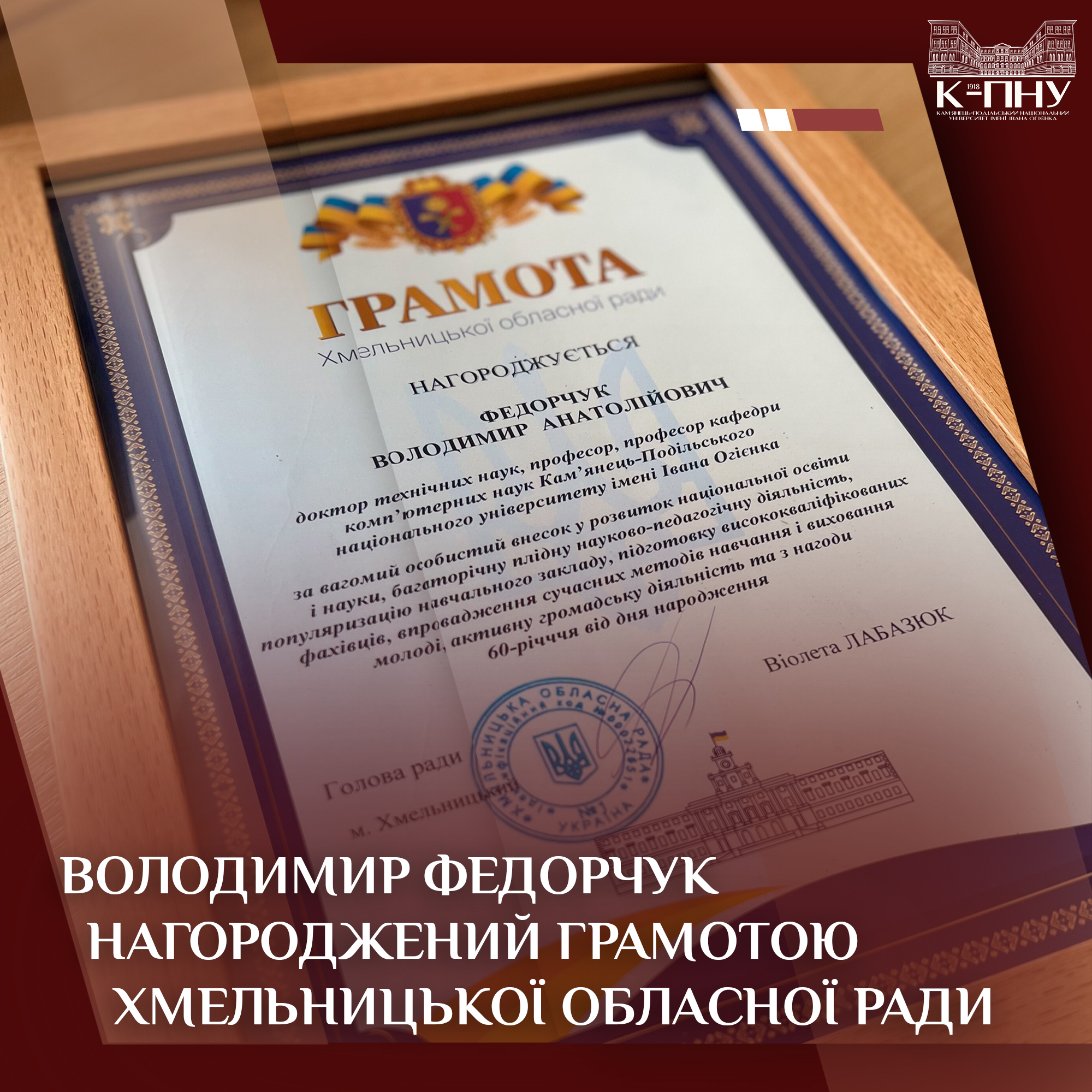 Щиро вітаємо Володимира Федорчука, доктора технічних наук, професора, професора кафедри комп’ютерних наук Кам’янець-Подільського національного університету імені Івана Огієнка із нагородженням грамотою Хмельницької обласної ради за вагомий особистий внесок у розвиток національної освіти і науки, багаторічну плідну науково-педагогічну діяльність, популяризацію навчального закладу, підготовку висококваліфікованих фахівців, впровадження сучасних методів навчання і виховання молоді, активну громадську діяльність та з нагоди 60-річчя від дня народження.