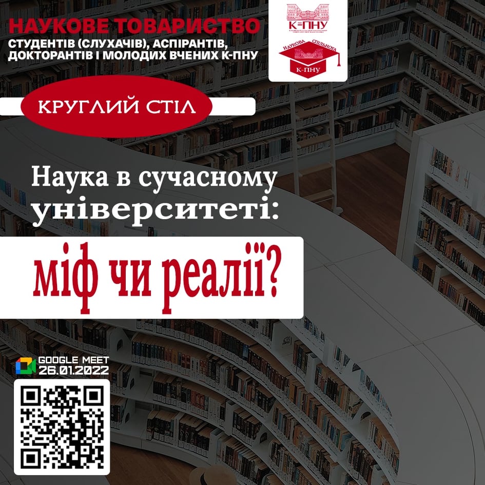 Наукове товариство студентів (слухачів), аспірантів, докторантів і молодих вчених К-ПНУ запрошує всіх охочих долучитися до круглого столу “Наука в сучасному університеті: міф чи реалії?”, який відбудеться 26 січня 2022 р. о 15:30 на платформі Google Meet.