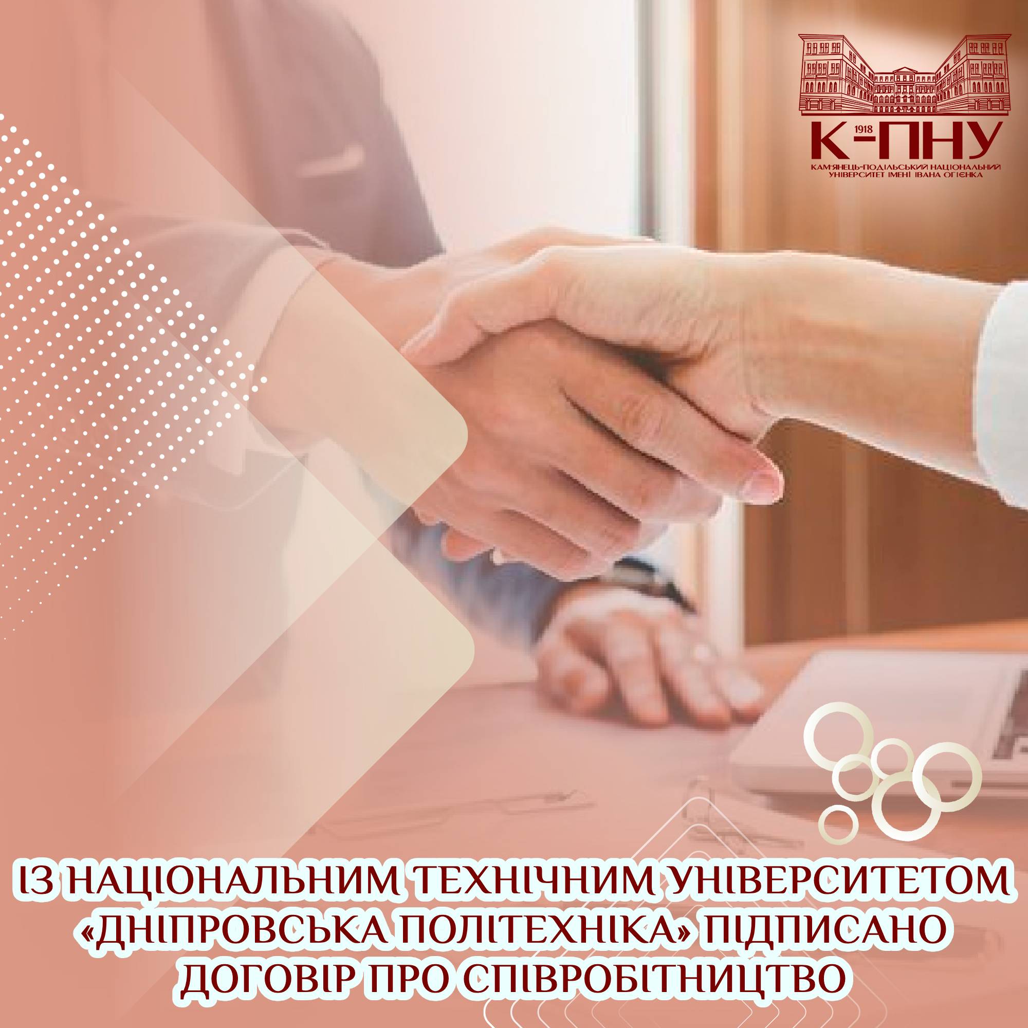 З метою реалізації проєктів у сфері освітньої та наукової діяльності, об’єднання зусиль задля підвищення рівня професійної підготовки фахівців, зокрема у сфері філології,  22 жовтня 2021 року між Кам’янець- Подільським національним університетом імені Івана Огієнка в особі ректора Сергія Копилова та Національним технічним університетом «Дніпровська політехніка» в особі ректора Олександра Азюковського підписано договір про співробітництво.