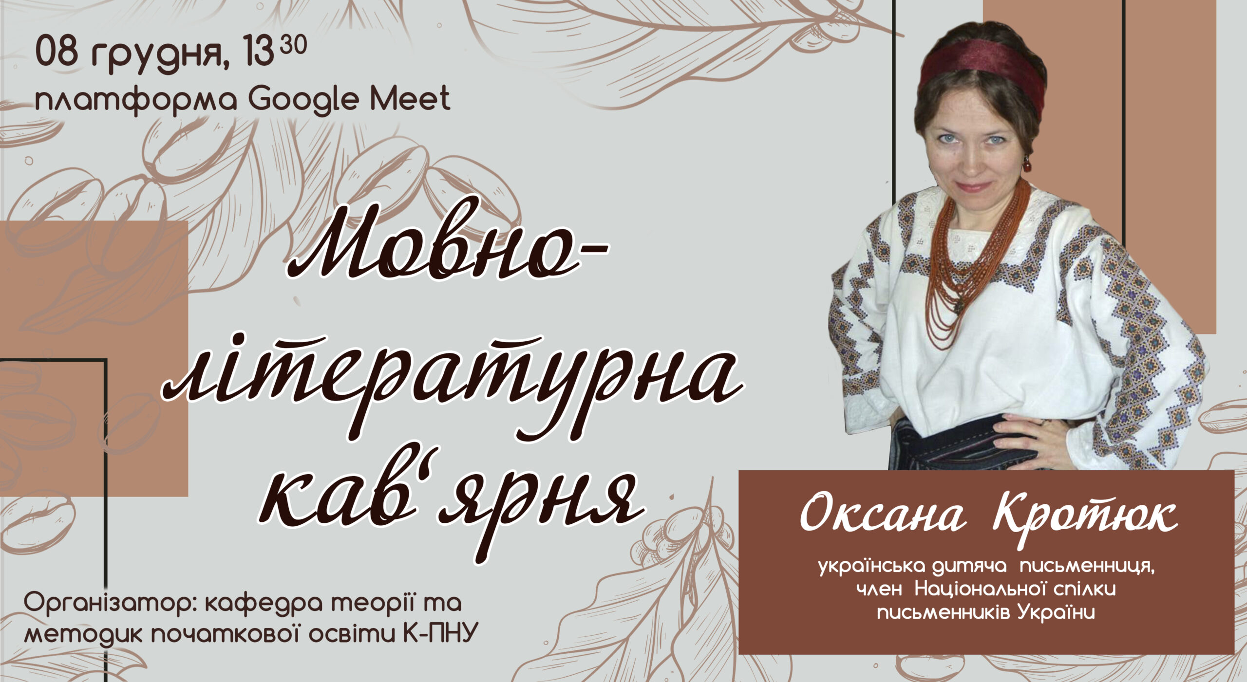 Запрошуємо всіх охочих долучитися до чергової зустрічі в межах проєкту “Мовно-літературна кав’ярня”, яка відбудеться 08 грудня о 13:30 на платформі Google Meet. Гостя зустрічі – Оксана Кротюк, українська дитяча  письменниця, член  Національної спілки письменників України.
