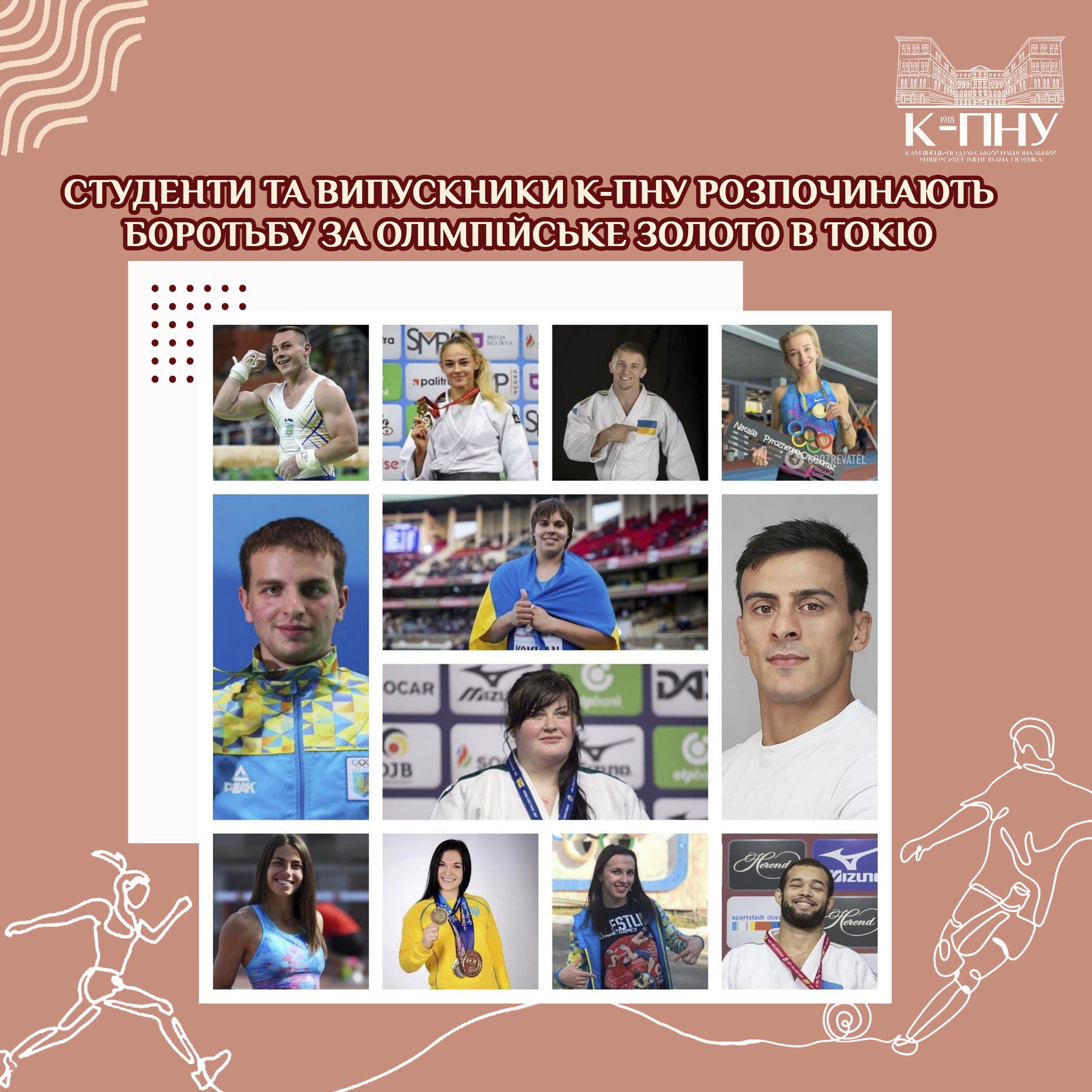 У складі олімпійської збірної студенти К-ПНУ Дар’я Білодід, студентка 4 курсу ( Fks1-B18), Артем Лесюк, студент 2 курсу магістратури (група Fks1-M20) презентуватимуть Україну у змаганнях із дзюдо, Наталія Пироженко-Чорномаз, студентка 2 курсу магістратури (група Fk1-M20) братиме участь у змаганнях із бігових дисциплін (естафетний біг 4×400 м); випускники факультету фізичної культури Геогрій Зантарая та Ньябалі Кеджау – учасники змагань із дзюдо, Оксана Лівач і Тетяна Кіт виборюватимуть нагороди у змаганнях із жіночої боротьби, Марина Бех-Романчук виступатиме у дисципліні стрибки у довжину, Сергій Куліш – у кульовій стрільбі, Ігор Радівілов – учасник команди у змаганнях із спортивної гімнастики. Ліцензію на участь у Олімпіаді-2020 також отримав абітурієнт спеціальності 017 Фізична культура і спорт Михайло Кохан, що презентуватиме Україну у змаганнях із метання молота.