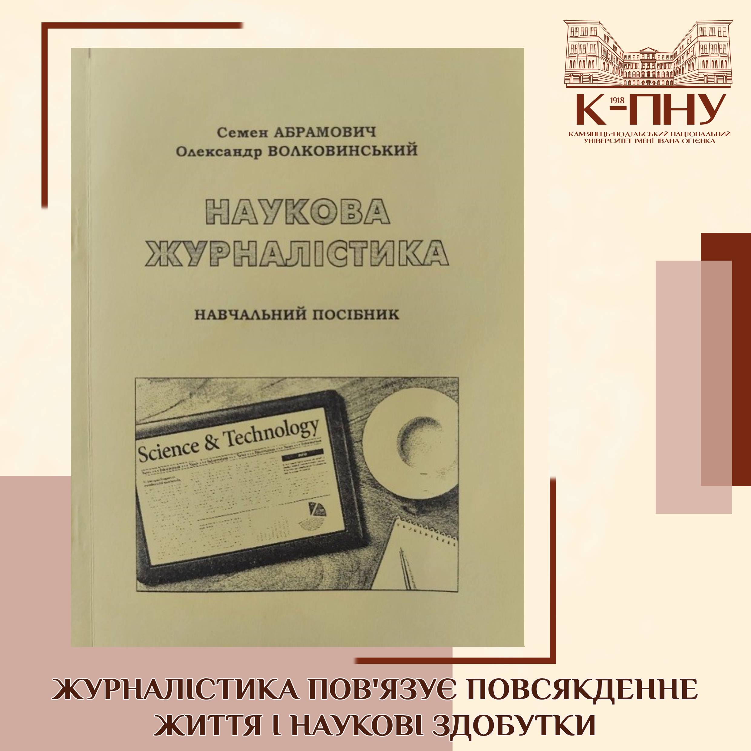 У Камʹянець-Подільському національному університеті імені Івана Огієнка вийшов друком навчальний посібник “Наукова журналістика”. Видання підготували викладачі університету, а саме: Семен Абрамович, доктор філологічних наук, професор, професор кафедри журналістики, і Олександр Волковинський, доктор філологічних наук, професор, завідувач кафедри журналістики.