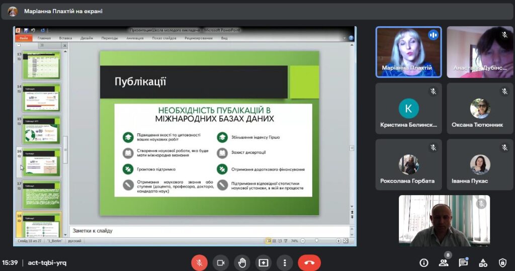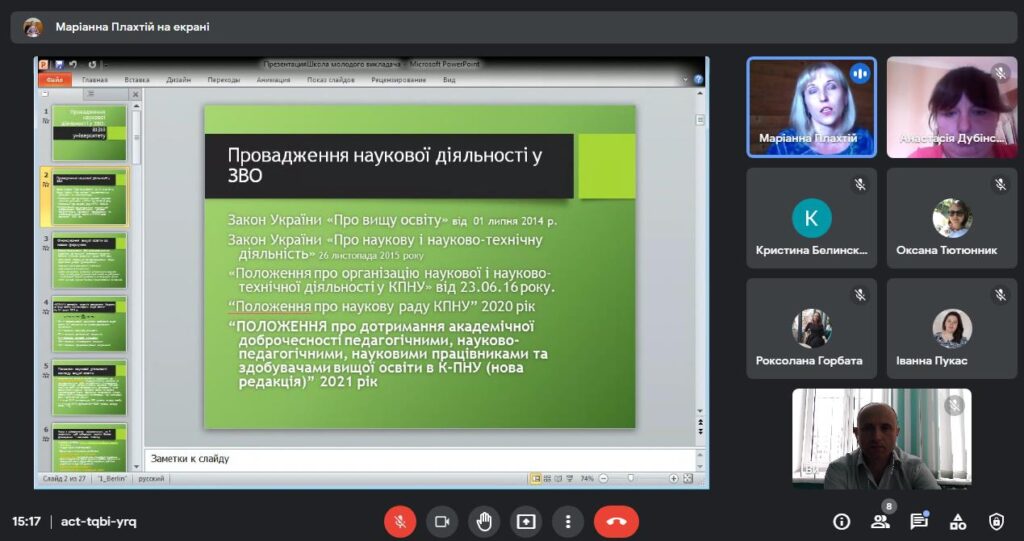 09 червня 2021 р. про сучасні підходи в науковій і науково-дослідній діяльності під час онлайн-зустрічі розповіла Маріанна Плахтій, керівник відділу наукової роботи, кандидат філософських наук, доцент. Мар’яна Петрівна розкрила основні аспекти наукової діяльності науково-педагогічних працівників К-ПНУ. Спікерка наголосила на важливості наукових досліджень для реалізації всіх стратегічних напрямів університету, адже розвиток та ефективне впровадження результатів наукових досліджень у виші є необхідною умовою підвищення його конкурентоздатності в світовому освітньому й науковому просторі.