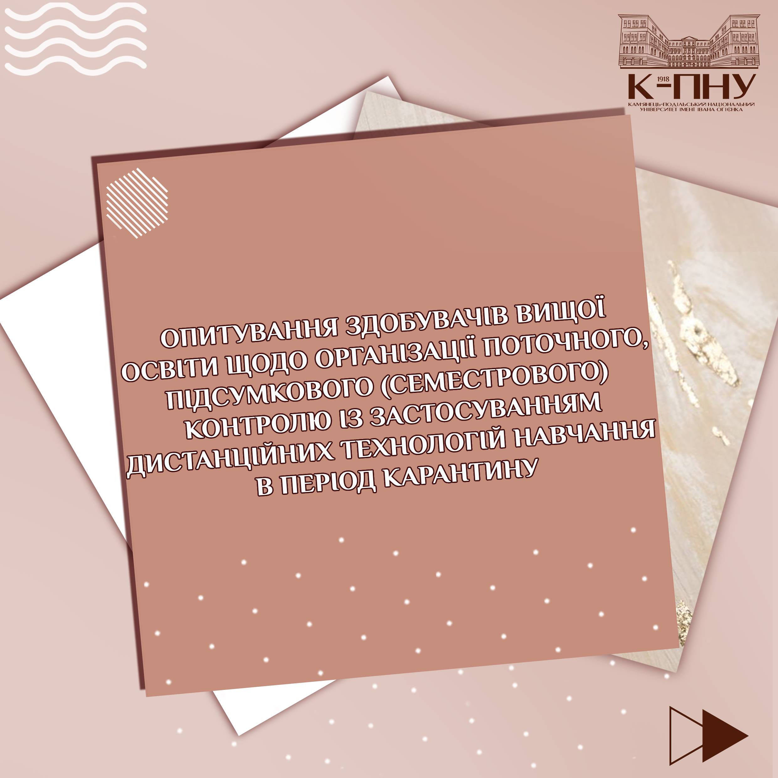 Відповідно до Плану заходів з оцінювання якості освітньої діяльності та якості вищої освіти в Кам’янець-Подільському національному університеті імені Івана Огієнка на ІІ семестр 2020-2021 н. р. із 24 травня до 25 червня 2021 р. навчально-методичний центр забезпечення якості освіти спільно з відділом аспірантури і докторантури, навчальним, заочним відділами, заступниками деканів факультетів з навчальної роботи та забезпечення якості вищої освіти розпочав опитування серед здобувачів вищої освіти освітніх ступенів «бакалавр», «магістр», «доктор філософії» денної та заочної форм здобуття вищої освіти (крім здобувачів вищої освіти випускних курсів, які пройшли зазначене опитування з 05 до 20 квітня 2021 р.) шляхом  анкетування «Організація поточного, підсумкового (семестрового) контролю здобувачів вищої освіти університету із застосуванням дистанційних технологій навчання в період карантину».