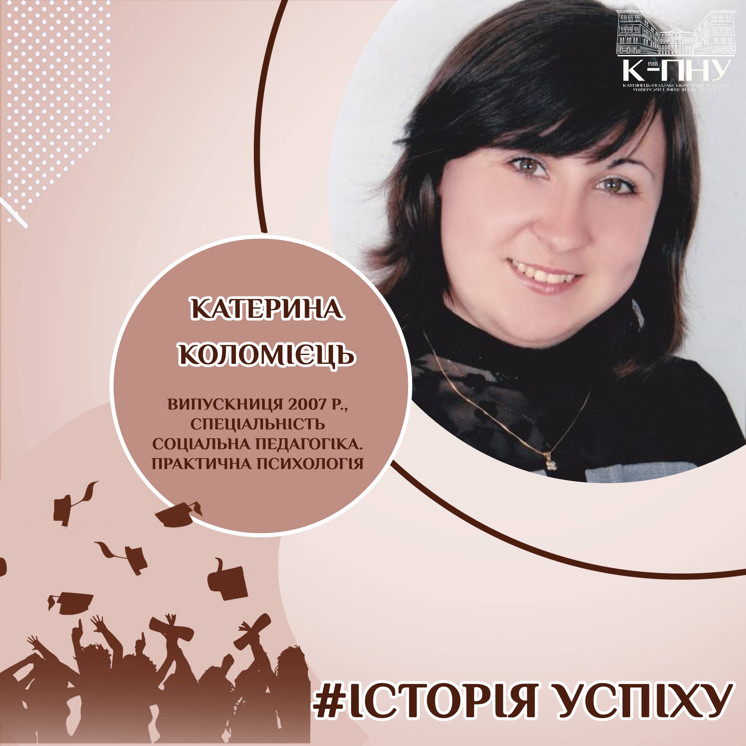 Катерина Коломієць – випускниця Інституту соціальної реабілітації та розвитку дитини (факультет корекційної та соціальної педагогіки і психології) 2007 року (спеціальність Соціальна педагогіка. Практична психологія, кваліфікація – соціальний педагог, практичний психолог в закладах освіти), практичний психолог Красилівської ЗОШ І-ІІІ ступенів №3, за сумісництвом – керівник гуртка науково-дослідницького напряму (Основи наукових досліджень з педагогіки (психології, соціології)