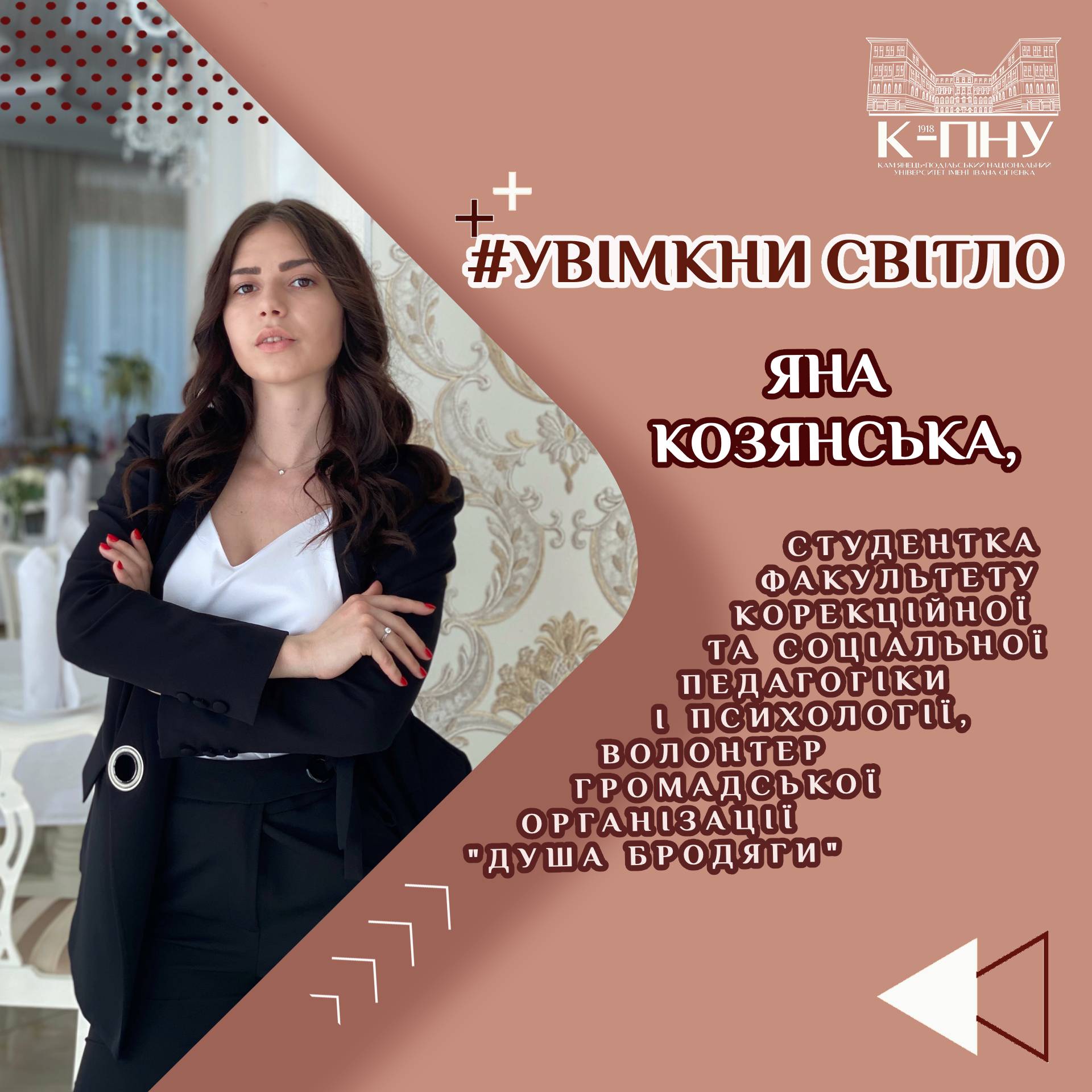 Яна Козярська – студентка 4 курсу факультету корекційної та соціальної педагогіки і психології, волонтер громадської організації “Душа бродяги”