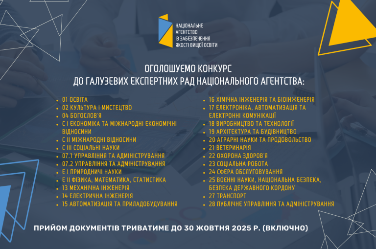 Відповідно до рішення Національного агентства із забезпечення якості вищої освіти 14 жовтня 2025 р. (протокол № 16) та Порядку висунення кандидатур і обрання членів галузевих експертних рад оголошено конкурс до галузевих експертних рад із 17 жовтня 2025 року до категорій: