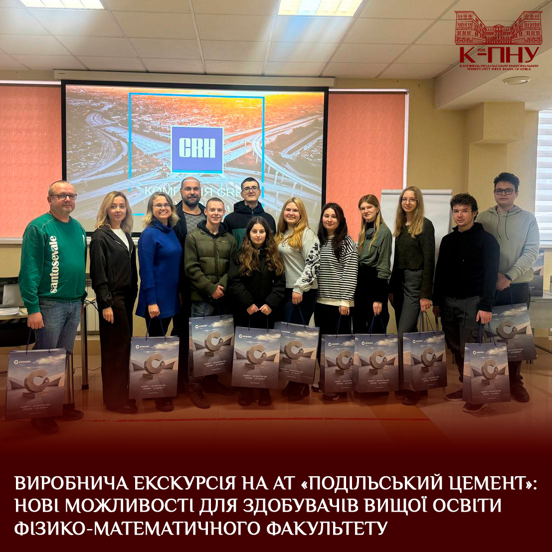 Здобувачі вищої освіти кафедри комп’ютерних наук та викладачі фізико-математичного факультету К-ПНУ здійснили важливу виробничу екскурсію на АТ «Подільський цемент», що входить до міжнародної групи компаній CRН. Ця подія стала ключовим етапом поєднання теоретичної підготовки з реальними виробничими процесами.