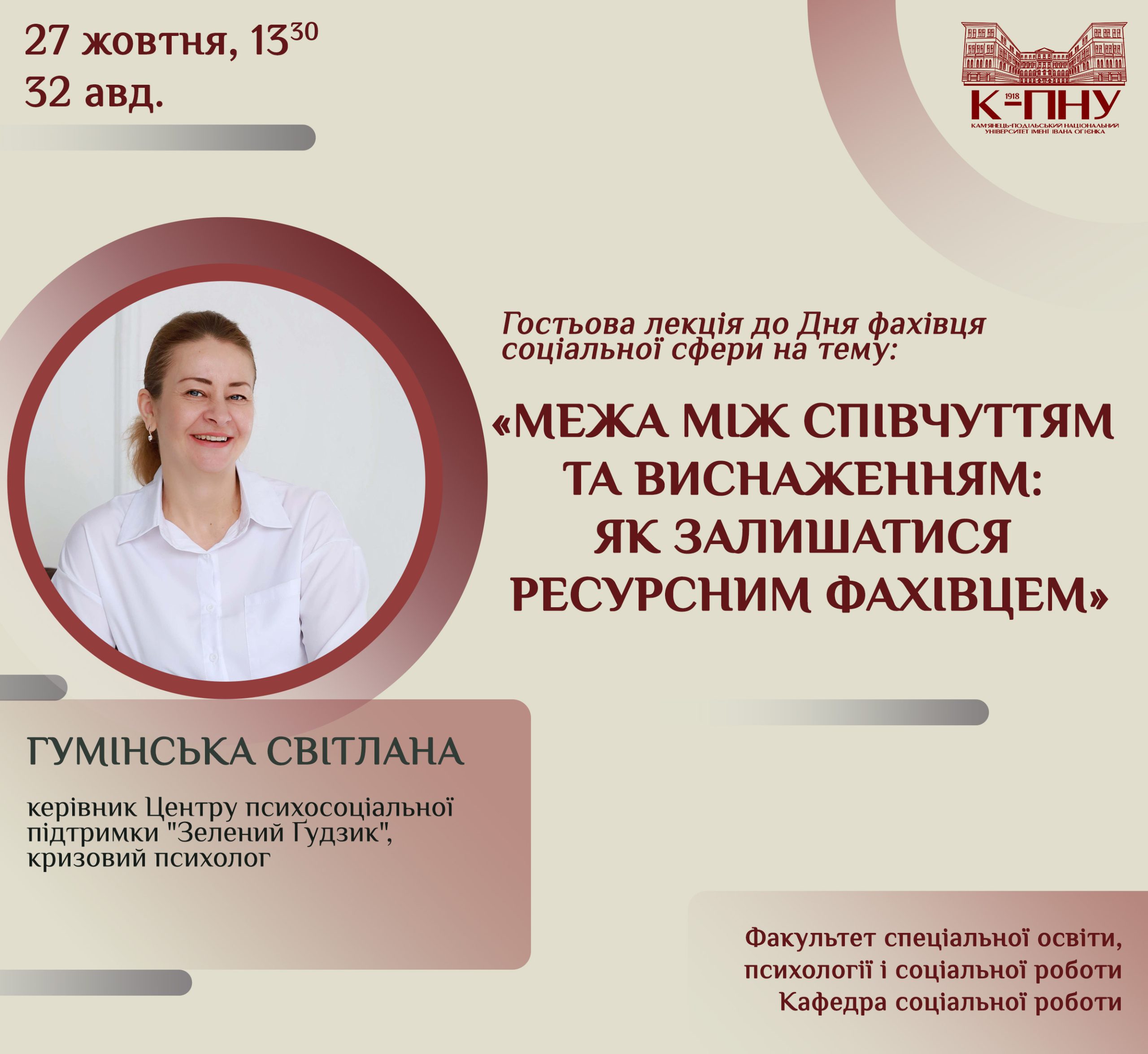 27 жовтня о 13:30 (32 авд.) відбудеться гостьова лекція з теми «Межа між співчуттям та виснаженням: як залишатися ресурсним фахівцем» до Дня фахівця соціальної сфери.