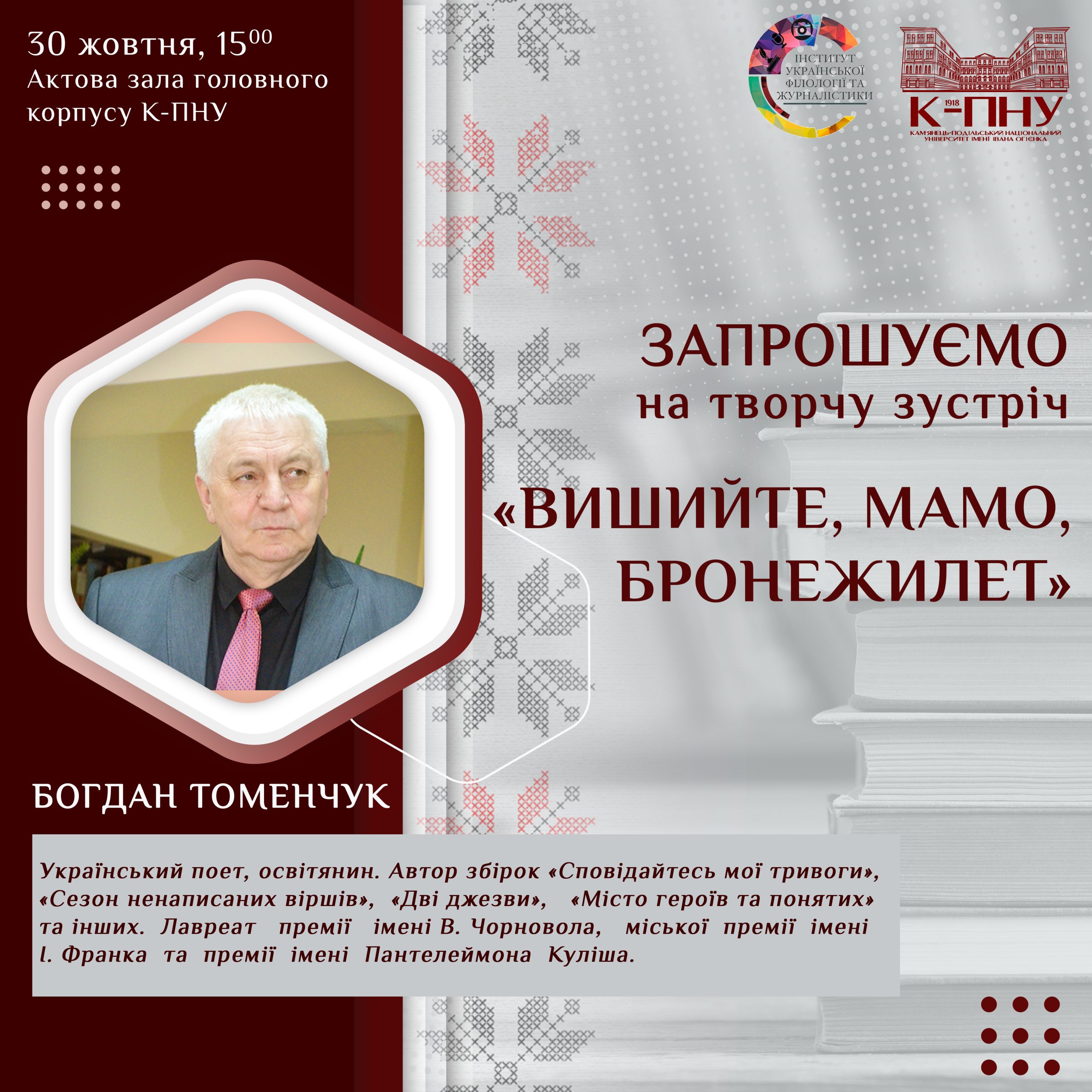 Запрошуємо на творчу зустріч з українським письменником Богданом Томенчуком, яка відбудеться 30 жовтня о 15:00 в актовій залі головного корпусу К-ПНУ.