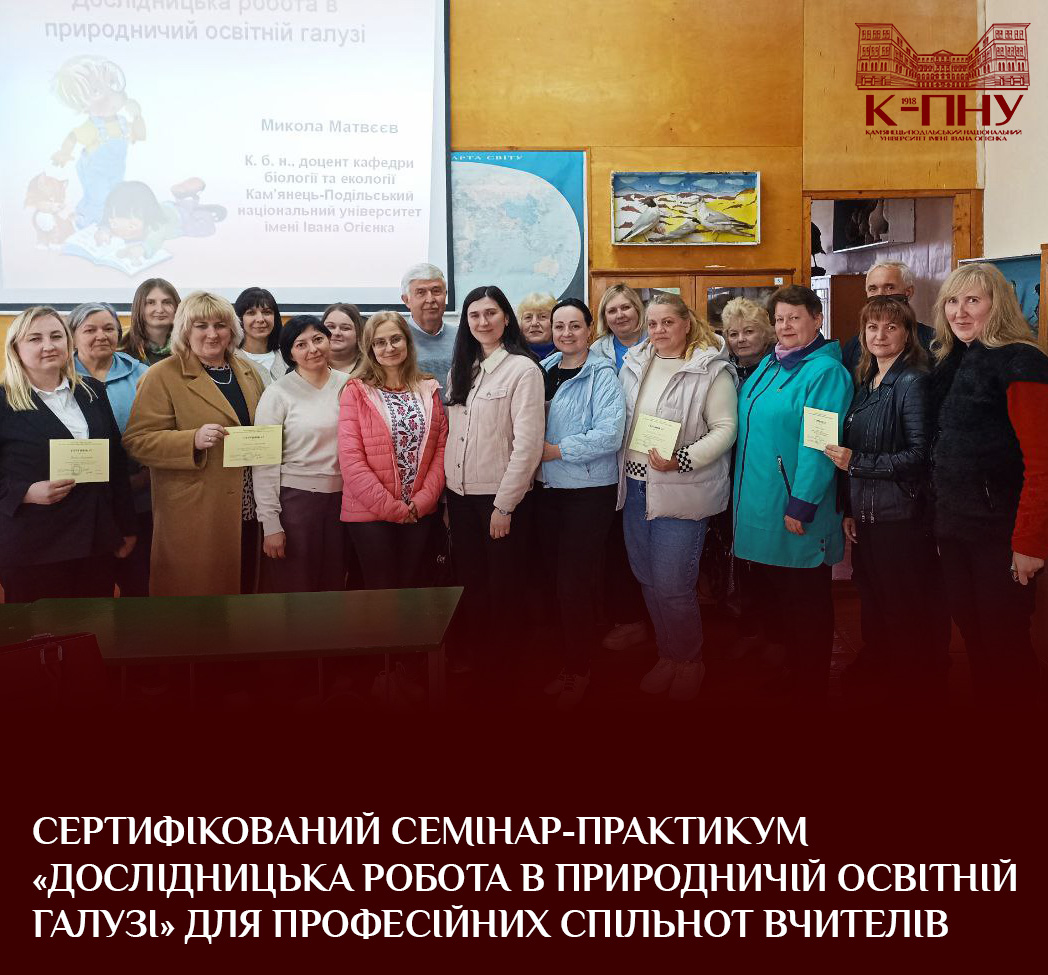 20 травня на базі природничо-економічного факультету К-ПНУ в межах співпраці із ЦПРПП Кам’янець-Подільської міської ради провели сертифікований семінар-практикум «Дослідницька робота в природничій освітній галузі» для професійних спільнот вчителів біології та інтегрованих курсів природничої освітньої галузі.