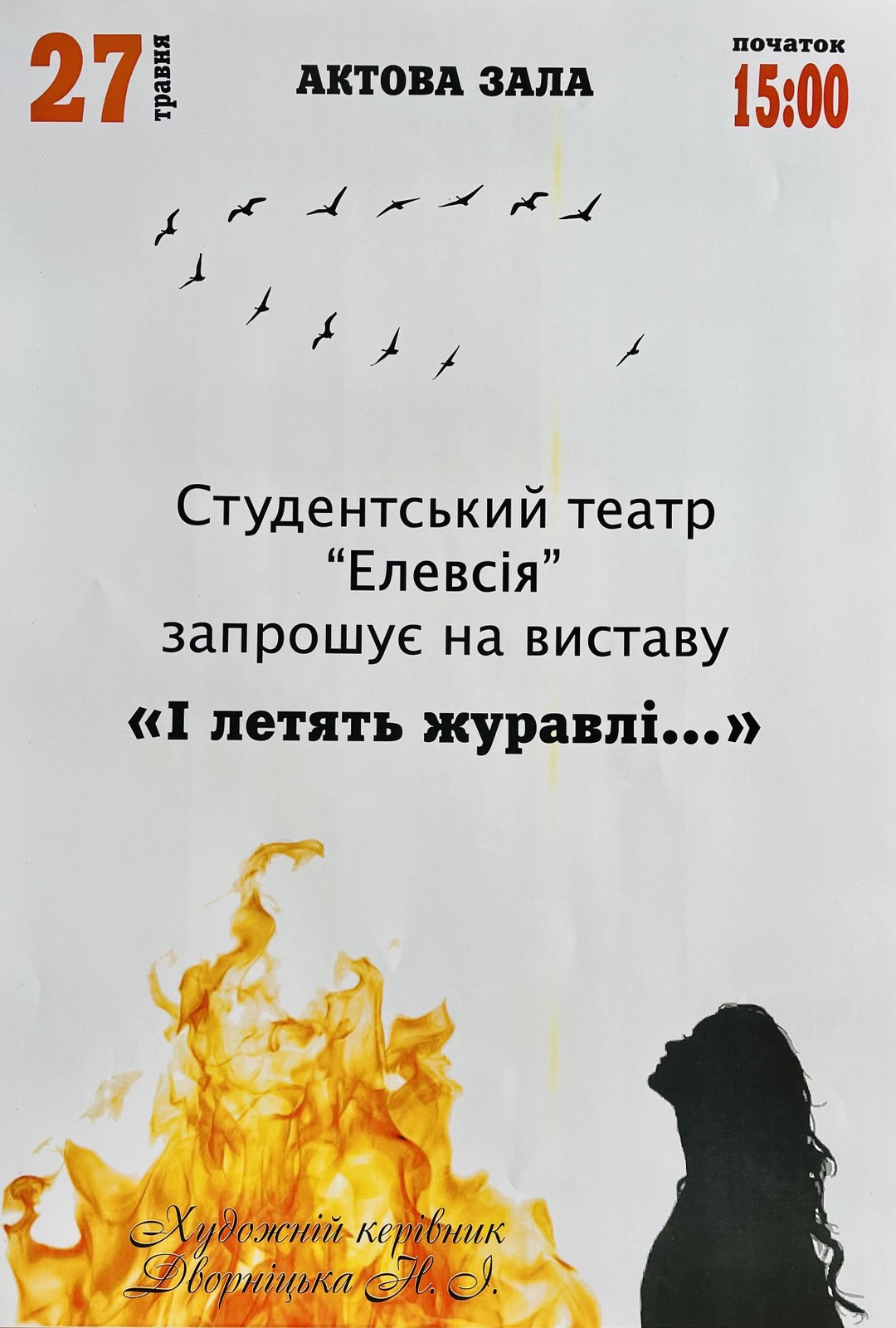 Студентський театр Університету Огієнка «Елевсія» (художній керівник – Наталія Дворніцька) запрошує відвідати виставу «І летять журавлі…».