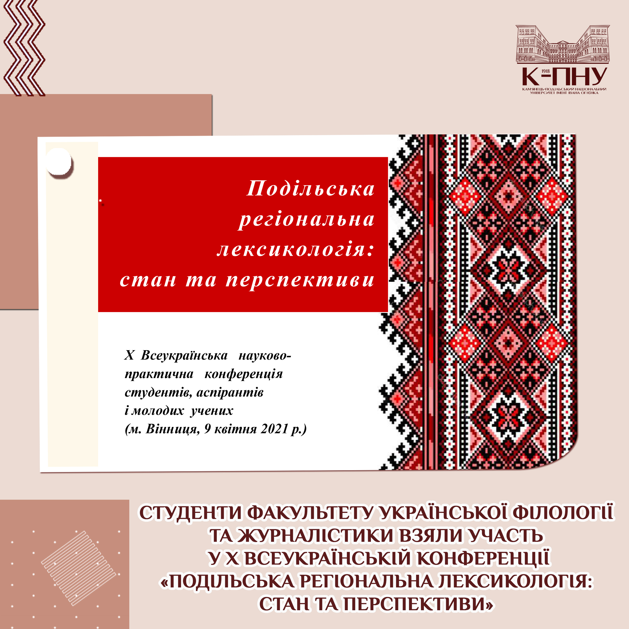 9 квітня 2021 р. у Вінницькому державному педагогічному університеті імені М. Коцюбинського відбулася чергова Х Всеукраїнська науково-практична конференція студентів, аспірантів і молодих учених «Подільська регіональна лексикологія: стан та перспективи» (модератор Гороф’янюк І.В., кандитат філологічних наук, доцент).