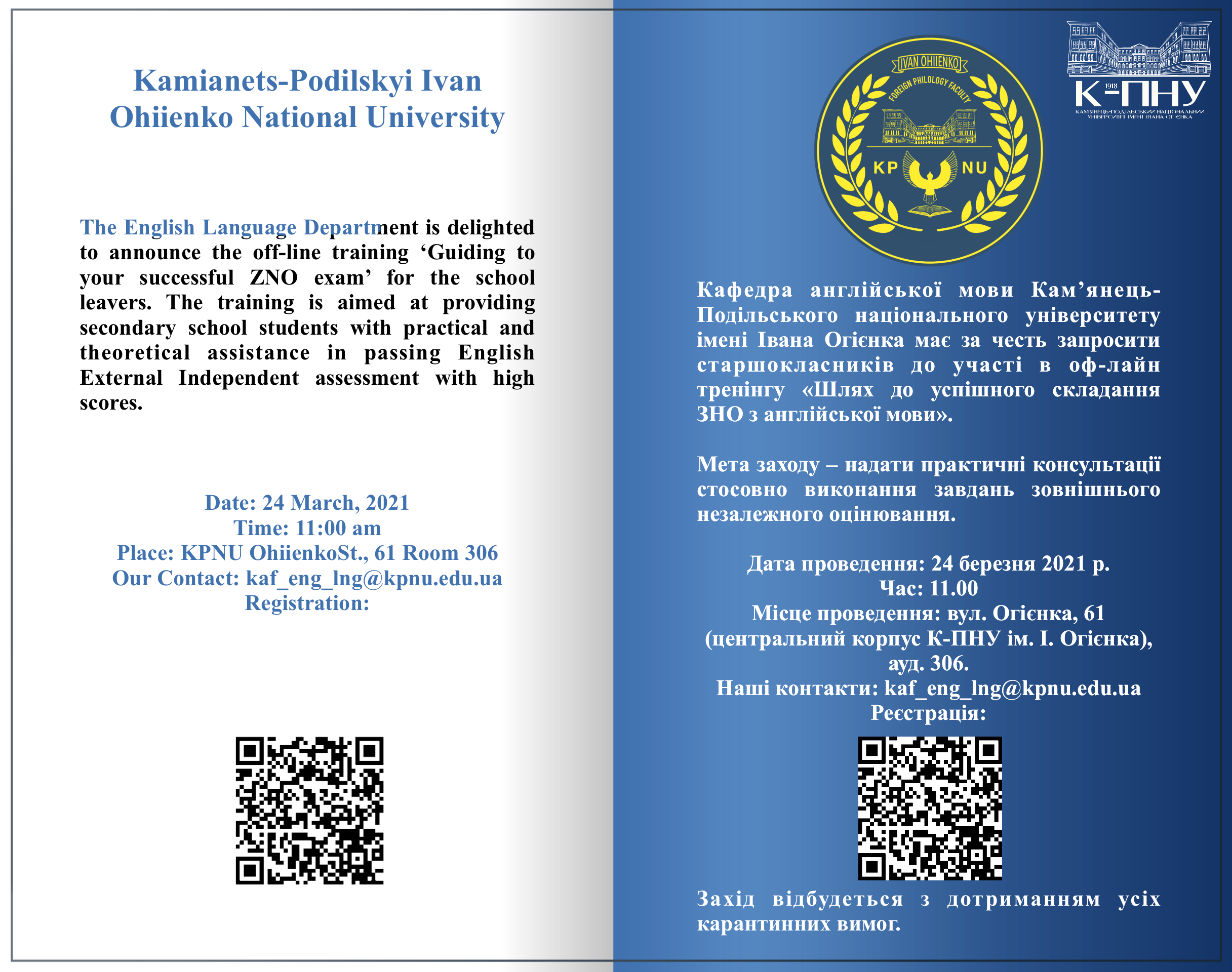 Кафедра англійської мови К-ПНУ має за честь запросити старшокласників до участі в офлайн-тренінгу «Шлях до успішного складання ЗНО з англійської мови». Мета заходу – надати практичні консультації щодо виконання завдань зовнішнього незалежного оцінювання.