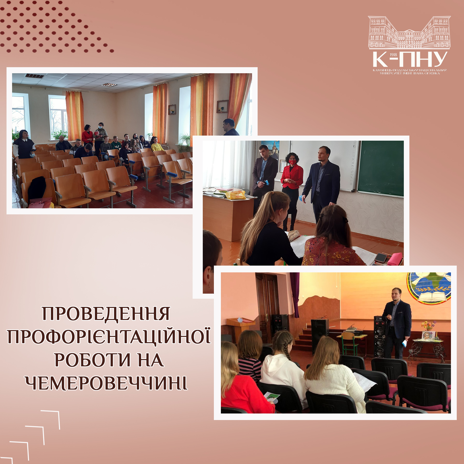 24 лютого 2020 року з метою профорієнтаційної роботи представники Кам’янець-Подільського національного університету імені Івана Огієнка, а саме: Алла Хоптяр, декан факультету іноземної філології, Наталія Гудима, завідувач кафедри теорії та методик початкової освіти, Андрій Лісовський, старший викладач кафедри географії та методики її викладання та Максим Сльозкін, магістрант історичного факультету відвідали заклади середньої освіти Чемеровецької ОТГ.