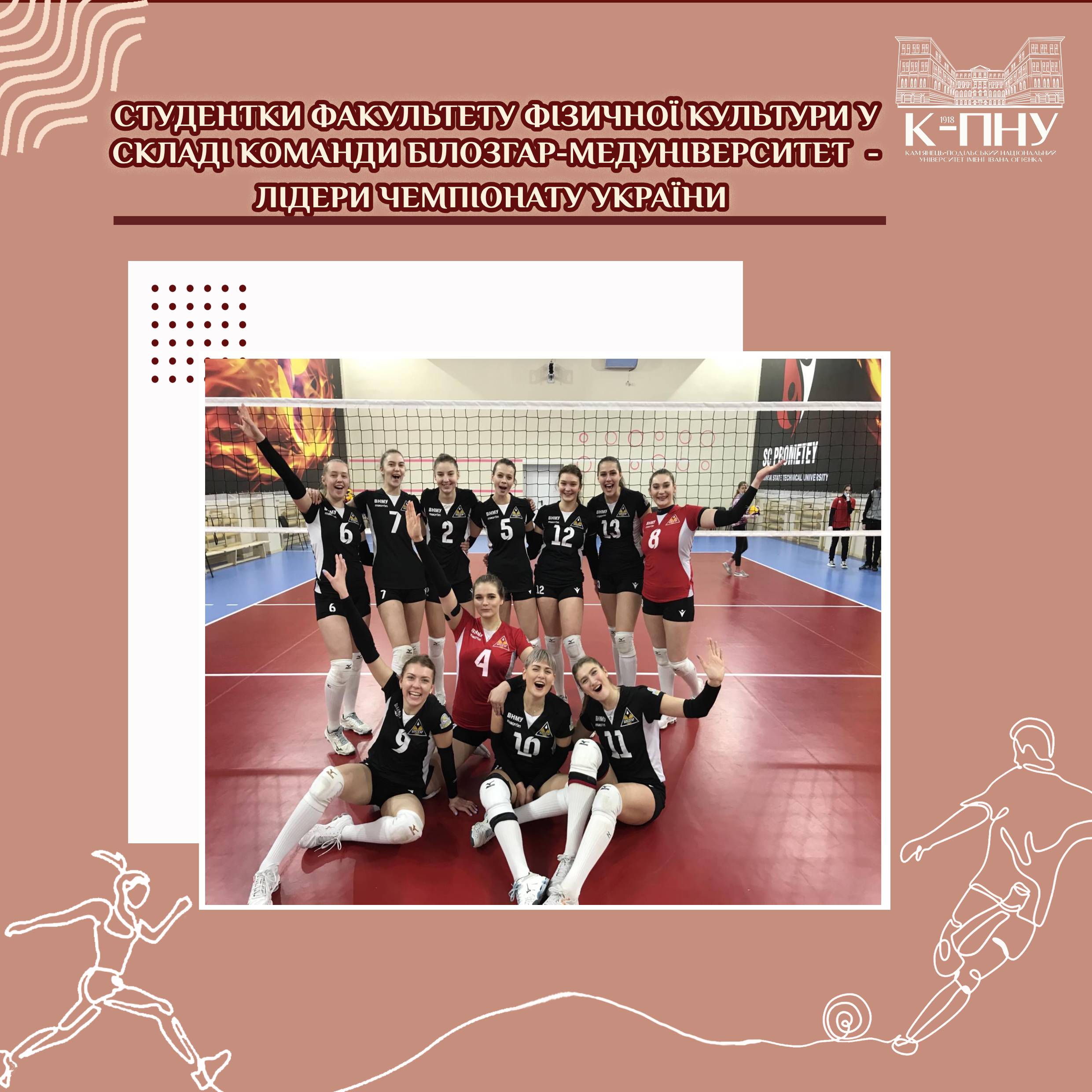 Приємно відзначити, що студентки факультету фізичної культури Ориш Діана (номер 7), Лазуренко Єлизавета (номер 9), Ковальчук Дарина (номер 11), Павляшик Ольга (номер 4), Якушева Валерія (номер 10), Воротниченко Валентина (номер 13) у складі команди Білозгар-Медуніверситет (м. Вінниця) вибороли 4 очки й утримують одноосібну передову позицію в чемпіонаті (загальна сума очок – 31).