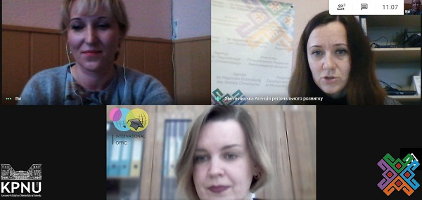28 грудня 2020 року відбулася перша онлайн-зустріч керівника відділу наукової роботи, доцента Маріанни Плахтій, керівника відділу міжнародних зв’язків, доцента Тетяни Сторчової  з керівником Агенції регіонального розвитку Хмельницької області Катериною Савчук. Під час зустрічі були розглянуті основні вектори розвитку співпраці К-ПНУ з Агенцією регіонального розвитку, окреслені першочергові завдання для розбудови партнерства на вітчизняному та міжнародному рівні в межах проєктної діяльності та інновацій, а також були досягнуті домовленості щодо спільних конкретних кроків задля втілення та реалізації пріоритетних і прогресивних ідей нашої alma mater.