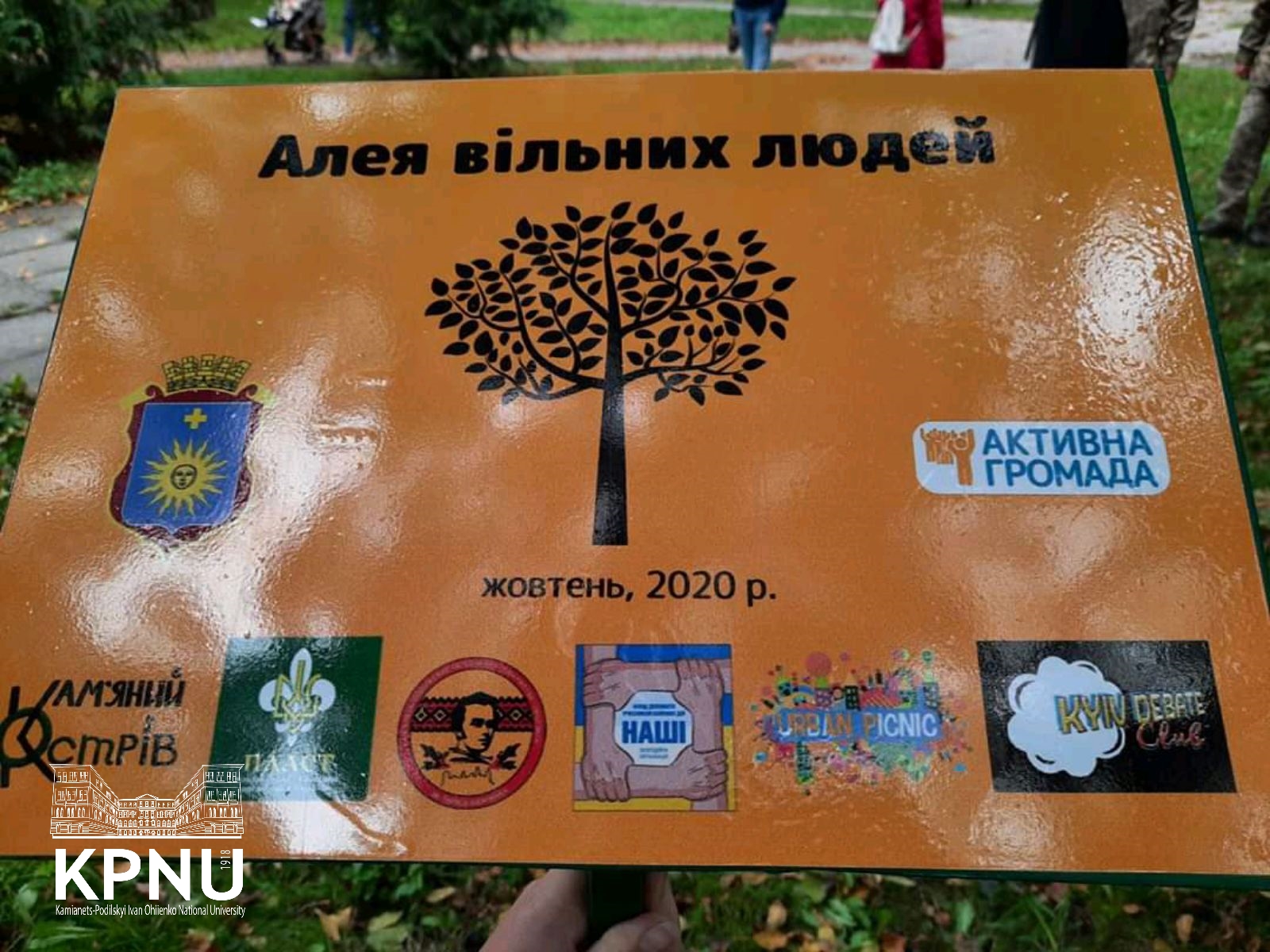 13 жовтня 2020 року студенти та викладачі факультету української філології та журналістики Кам’янець-Подільського національного університету імені Івана Огієнка, члени Кам’янець-Подільського об’єднання товариства «Просвіта» ім. Тараса Шевченка, долучилися до Всеукраїнської акції з висадки молодих дерев дуба червоного та створення «Алеї вільних людей» у м. Кам’янець-Подільський (Сквер Танкістів). Інститут «Республіка» та Всеукраїнська ініціатива «Активна громада» провели цю акцію в тридцяти містах України. Метою було не тільки сприяння у збільшенні зелених та рекреаційних зон у нашому місті, а й об’єднання зусиль громадян міста, щоб подякувати військовим напередодні Дня захисника України за захист свободи нашої країни.