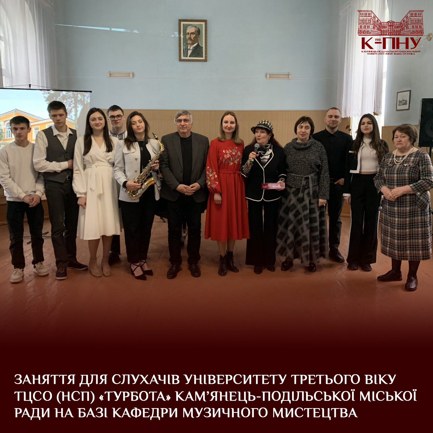 На базі кафедри музичного мистецтва відбулось заняття для слухачів Університету третього віку ТЦСО (НСП) «Турбота» Кам’янець-Подільської міської ради. У межах зустрічі декан педагогічного факультету професор Наталія Бахмат ознайомила присутніх з історією створення факультету та особливостями його сучасного розвитку, а також детально розповіла про здобутки й перспективи. Завідувачі кафедр презентували свої спеціальності, освітні програми, напрями діяльності та можливості подальшого розвитку.