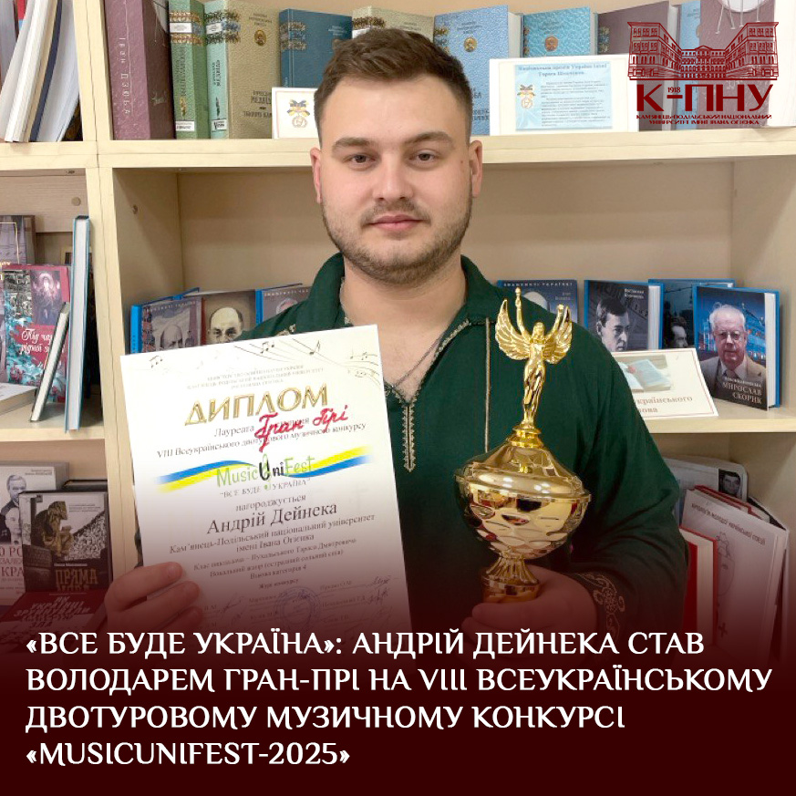 Студент магістратури спеціальності «Середня освіта (Мистецтво. Музичне мистецтво)» Андрій Дейнека (клас старшого викладача Тараса Пухальського) виборов гран-прі у VIII Всеукраїнському двотуровому музичному конкурсі «MusicUniFest-2025» «Все буде Україна» у вокальному жанрі (номінація «естрадний сольний спів»).