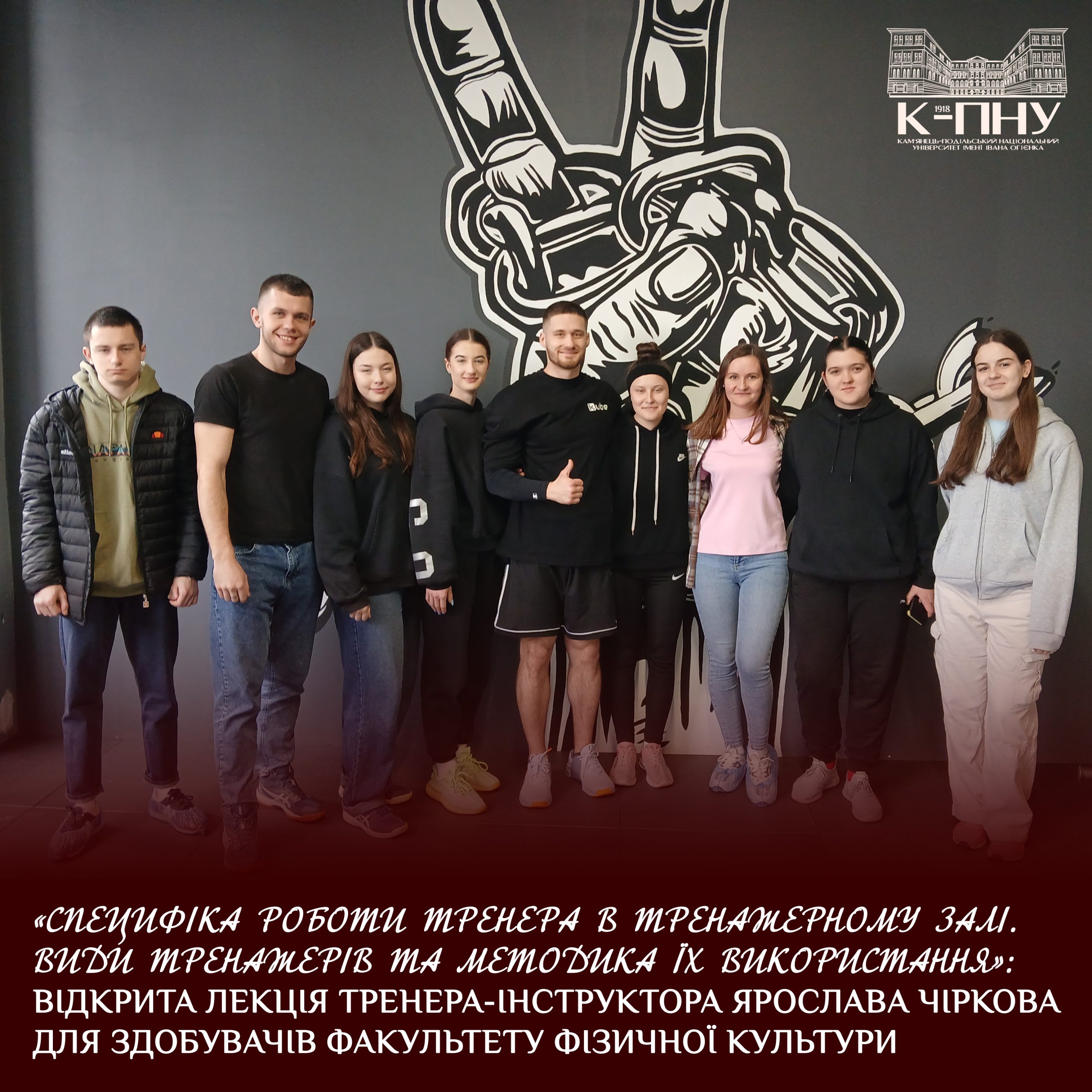 01 квітня 2025 року на базі спортклубу «Kube» (м. Кам’янець-Подільський) відбулась відкрита лекція для здобувачів факультету фізичної культури на тему: «Специфіка роботи тренера в тренажерному залі. Види тренажерів та методика їх використання». Лекцію провів тренер-інструктор Ярослав Чірков.