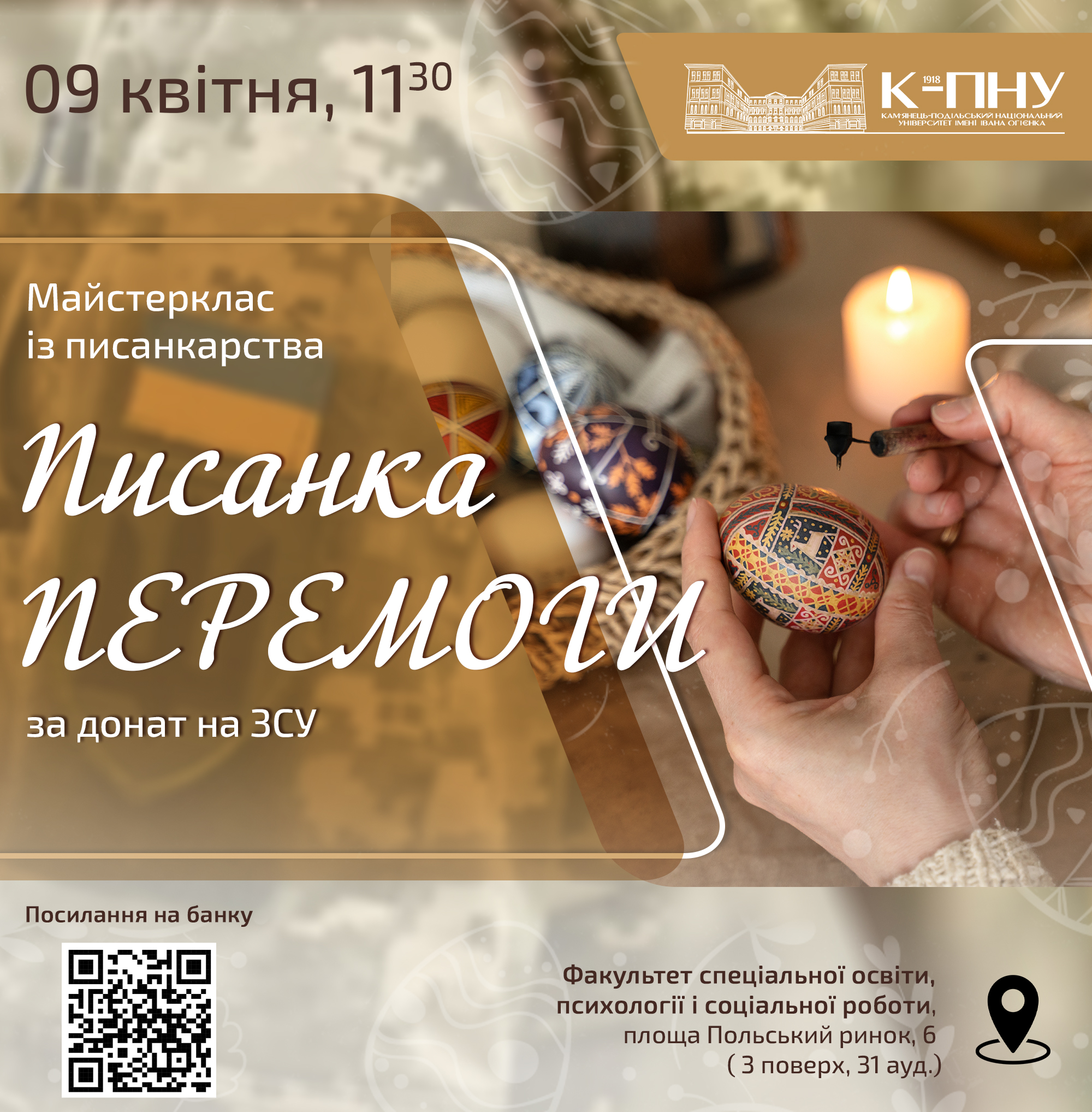 09 квітня (середа) об 11:30 відбудеться майстерклас «Писанка ПЕРЕМОГИ» за донат на ЗСУ.