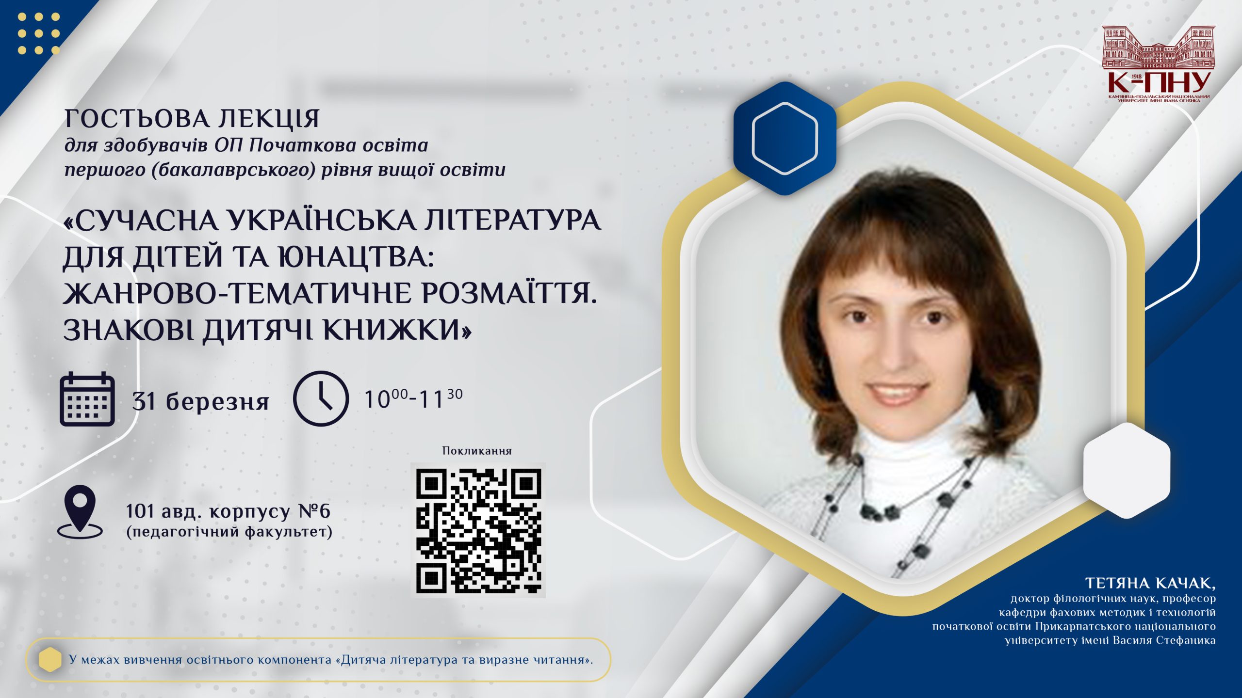 31 березня о 10:00 в межах вивчення освітнього компонента «Дитяча література та виразне читання» відбудеться гостьова лекція «Сучасна українська література для дітей та юнацтва: жанрово-тематичне розмаїття. Знакові дитячі книжки» для здобувачів ОП Початкова освіта першого (бакалаврського) рівня вищої освіти.