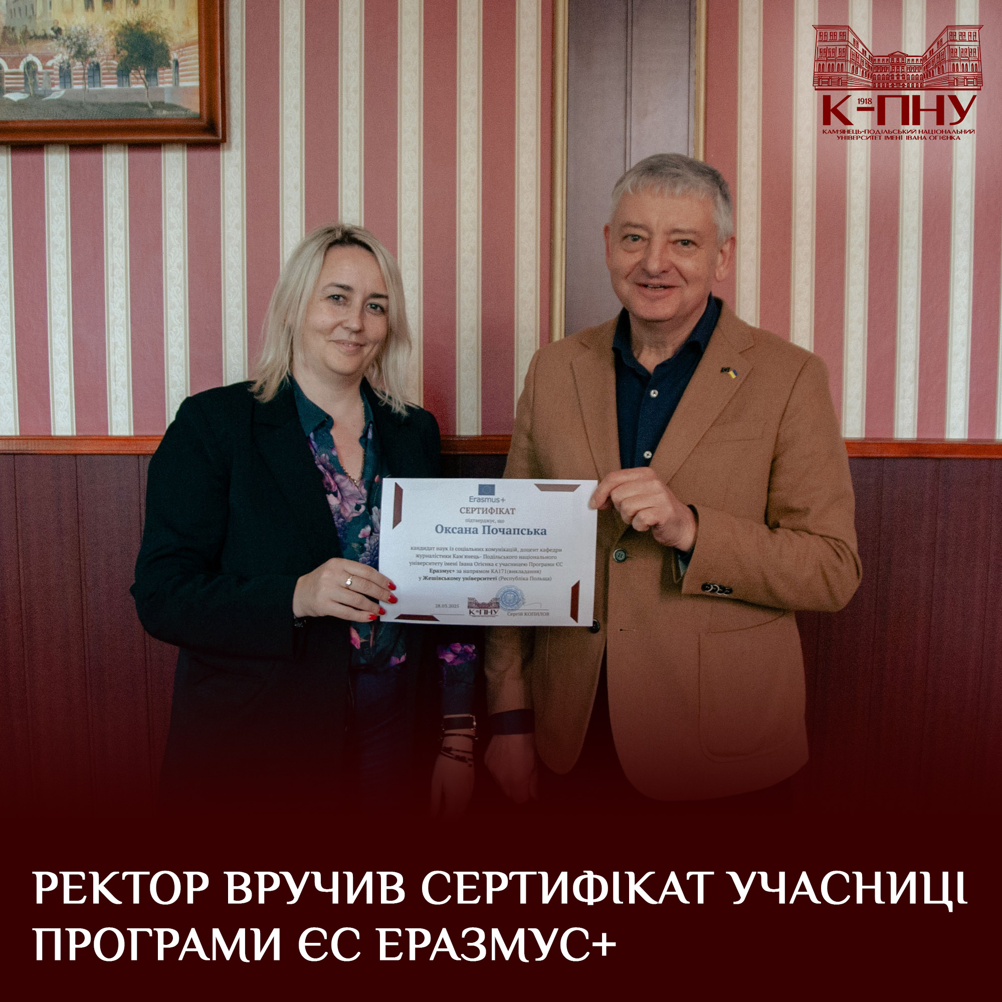 28 березня 2025 р. ректор університету Сергій Копилов вручив сертифікат учасниці міжнародної академічної мобільності в межах Програми ЄС Еразмус+ (КА171) кандидату наук із соціальних комунікацій, доценту, доценту кафедри журналістики К-ПНУ Оксані Почапській, яка здобула перемогу в конкурсі, оголошеному відділом міжнародних зв’язків 10 березня 2025 року.