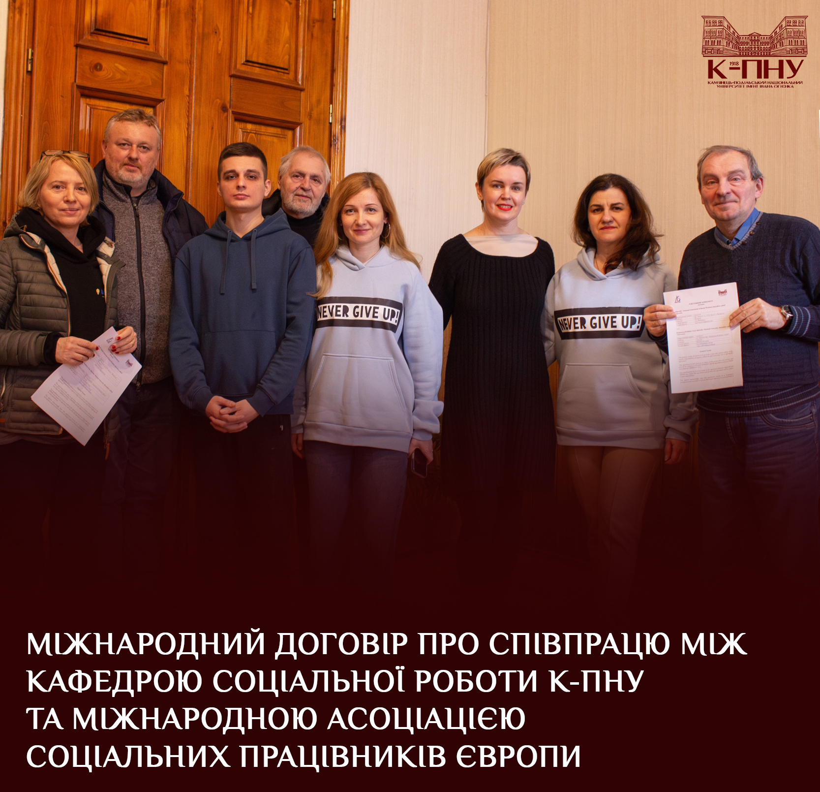 11 січня 2024 року кафедра соціальної роботи К-ПНУ (факультет спеціальної освіти, психології та соціальної роботи) підписала міжнародний договір про співпрацю та реалізацію спільного проєкту «PREVENT, PROTECT AND PROVIDE FOR CHILDREN IN UKRAINE» із Міжнародною асоціацією соціальних працівників Європи.