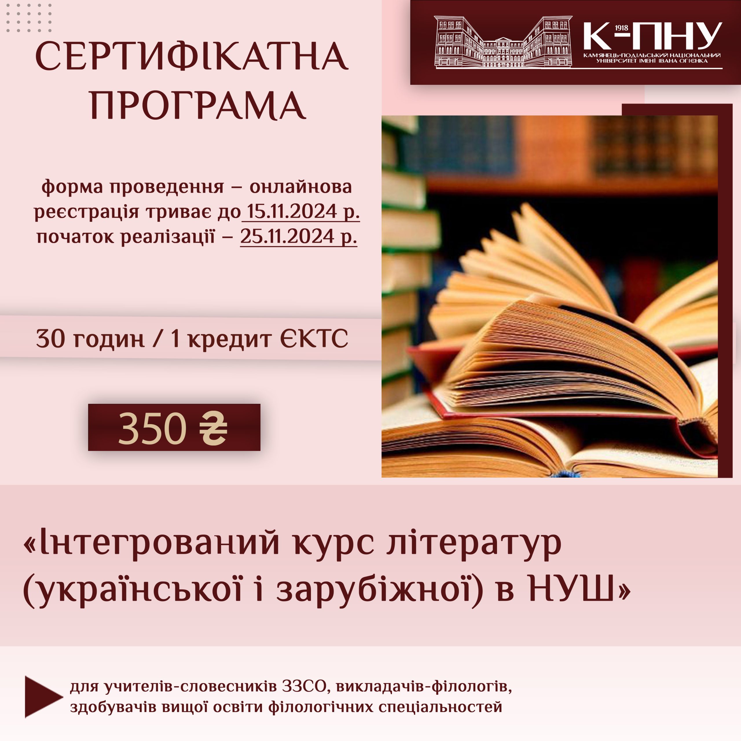 Для тих, хто бажає сформувати базові знання, вміння, навички професійної діяльності з реалізації експериментального навчального курсу «Інтегрований курс літератур (української і зарубіжної) в НУШ», Кам’янець-Подільський національний університет імені Івана Огієнка пропонує пройти ефективну теоретичну і практичну підготовку за сертифікатною програмою та отримати сертифікат провідного державного ЗВО України.