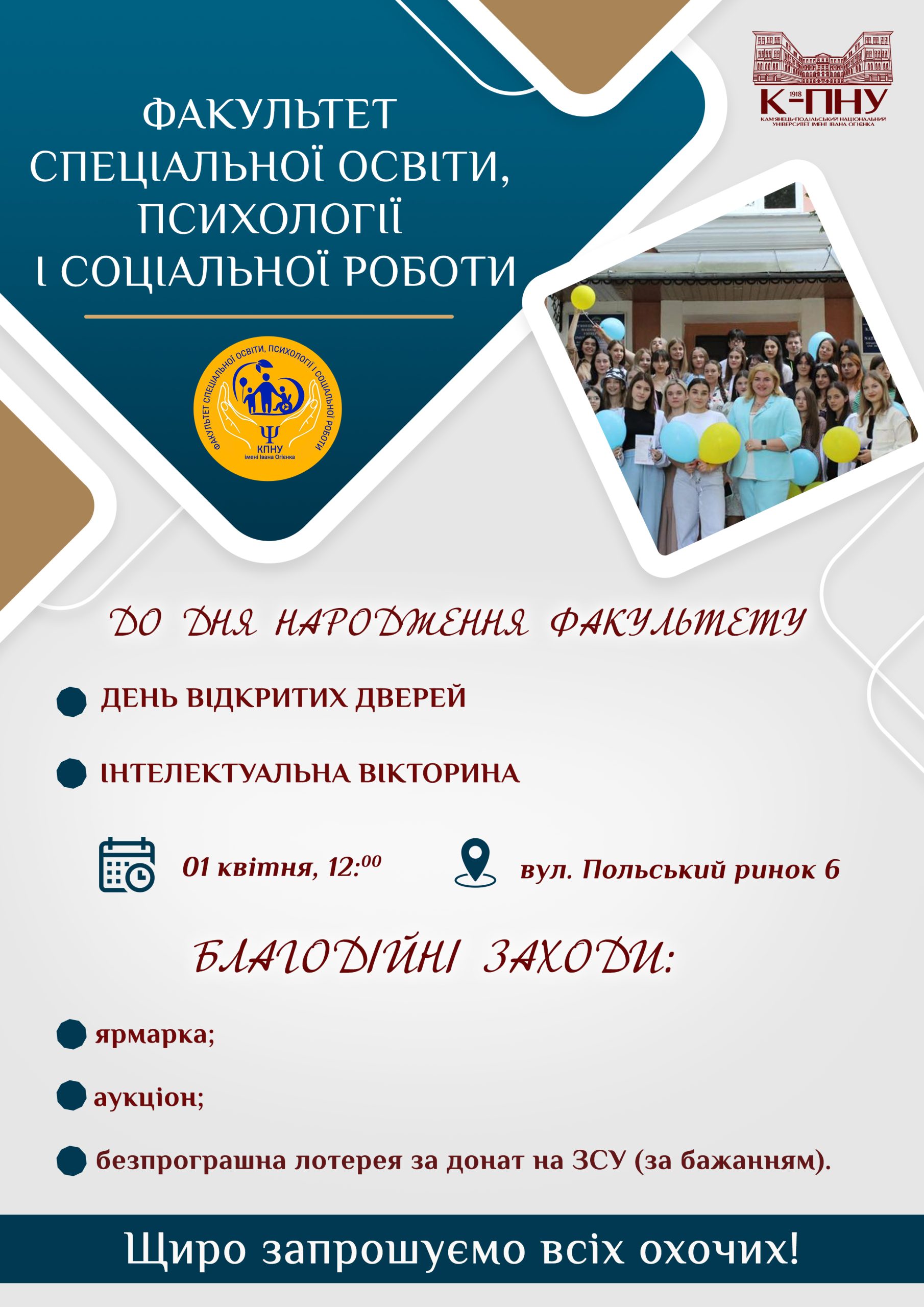 Факультет спеціальної освіти, психології і соціальної роботи К-ПНУ запрошує всіх охочих відвідати День відкритих дверей. Вибір професії  – це велика відповідальність перед батьками, перед суспільством, перед собою.  Навчання на факультеті поєднує в собі і творчість, і раціональність, і знання, і постійний розвиток.  Ви матимете змогу ознайомитись зі спеціальностями, отримати відповіді на всі питання щодо вступу, навчання, дозвілля, проживання.