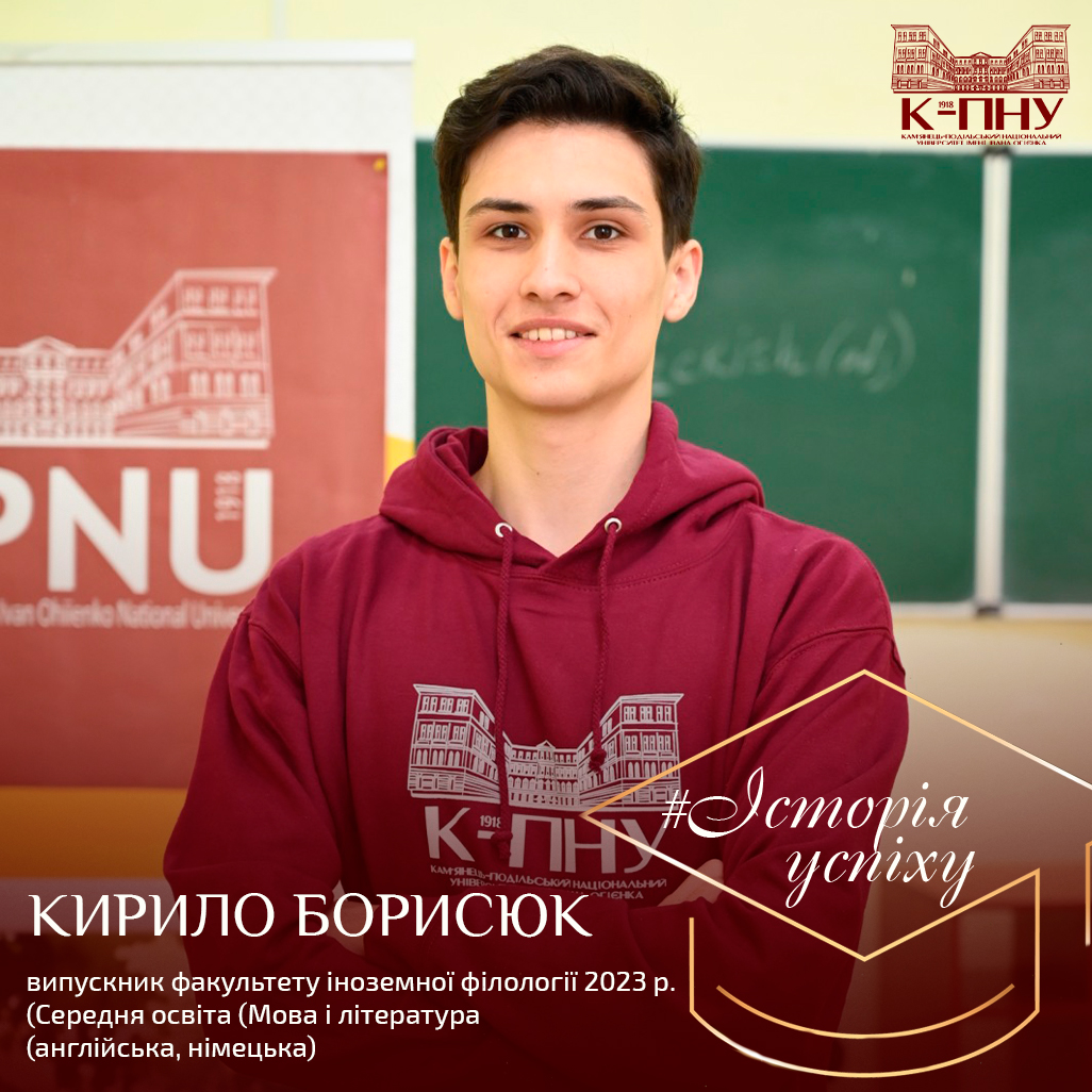 Кирило Борисюк– випускник К-ПНУ 2023 р. факультету іноземної філології, освітньої програми Середня освіта (Мова і література (англійська, німецька). Працює провідним фахівцем відділу міжнародних зв’язків.