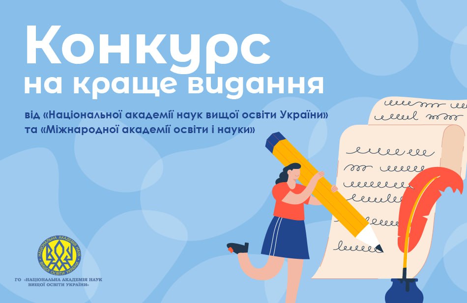 Інформуємо, що громадські організації «Національна академія наук вищої освіти України» та «Міжнародна академія освіти і науки» з метою всебічної підтримки освітян і науковців, талановитих молодих учених проводять щорічний конкурс на краще видання, яке отримало визнання серед наукової та освітянської спільноти (період видання – з 2021 по 2023 рр. включно).