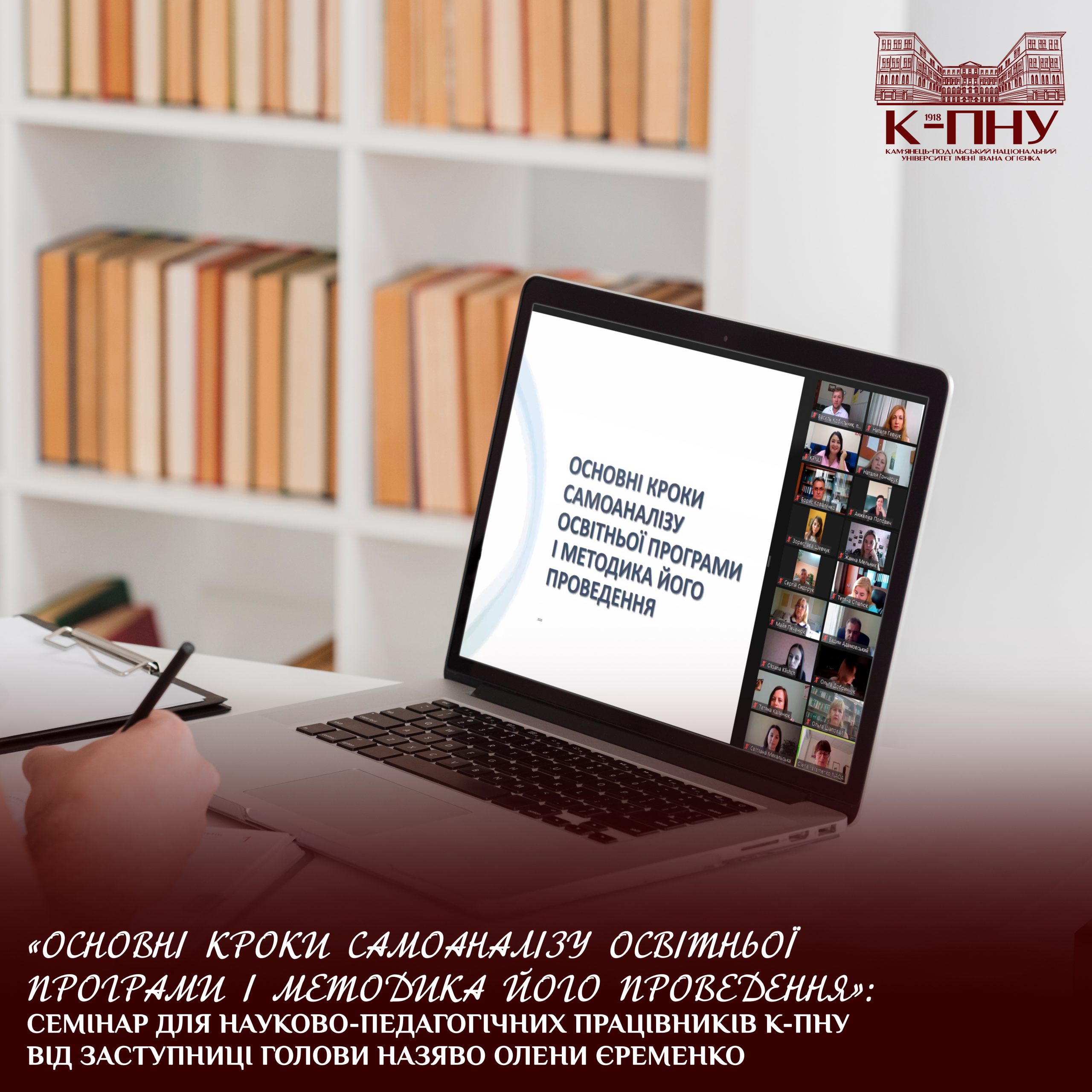 19 вересня 2023 року  в межах реалізації програми підвищення кваліфікації науково-педагогічних працівників «Акредитація освітніх програм: механізми забезпечення якості вищої освіти в К-ПНУ» відбувся онлайновий семінар «Основні кроки самоаналізу освітньої програми і методика його проведення», який провела заступниця голови Національного агентства із забезпечення якості вищої освіти Олена Єременко.