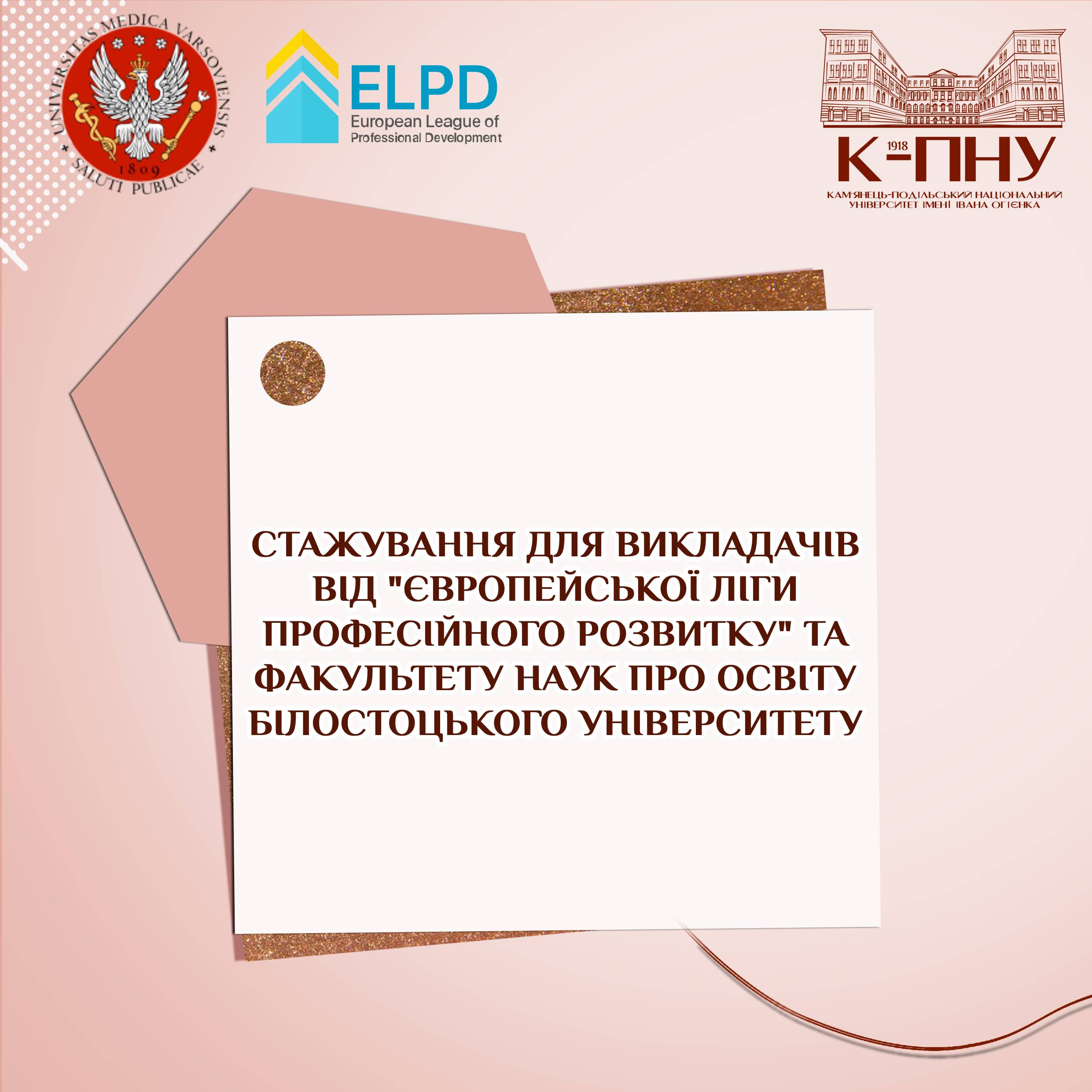 «Європейська ліга професійного розвитку» разом із Білостоцьким університетом (факультет Наук про Освіту) організовує дистанційне стажування для педагогічних і науково-педагогічних працівників закладів вищої освіти I-IV рівнів акредитації незалежно від форм власності та підпорядкування за темою: «Навчально-наукова діяльність в сучасному університеті: виклики, рішення, перспективи».