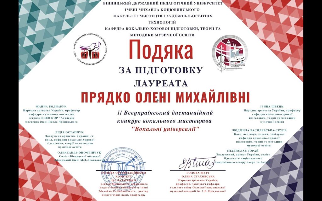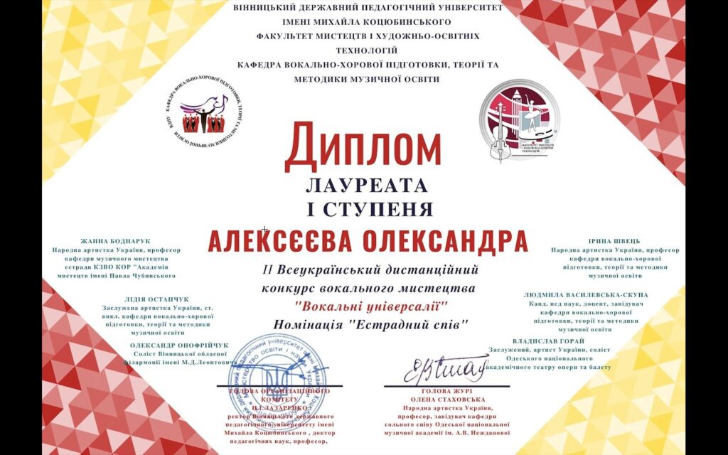 Вітання Олександрі Алексєєвій, студентці 4 курсу спеціальності Музичне мистецтво (клас доцента Олени Прядко). Олександра здобула перемогу в ІІ Всеукраїнському дистанційному конкурсі вокального мистецтва “Вокальні універсалії”, що відбувся на базі факультету мистецтв і художньо-освітніх технологій Вінницького державного педагогічного університету імені Михайла Коцюбинського.
