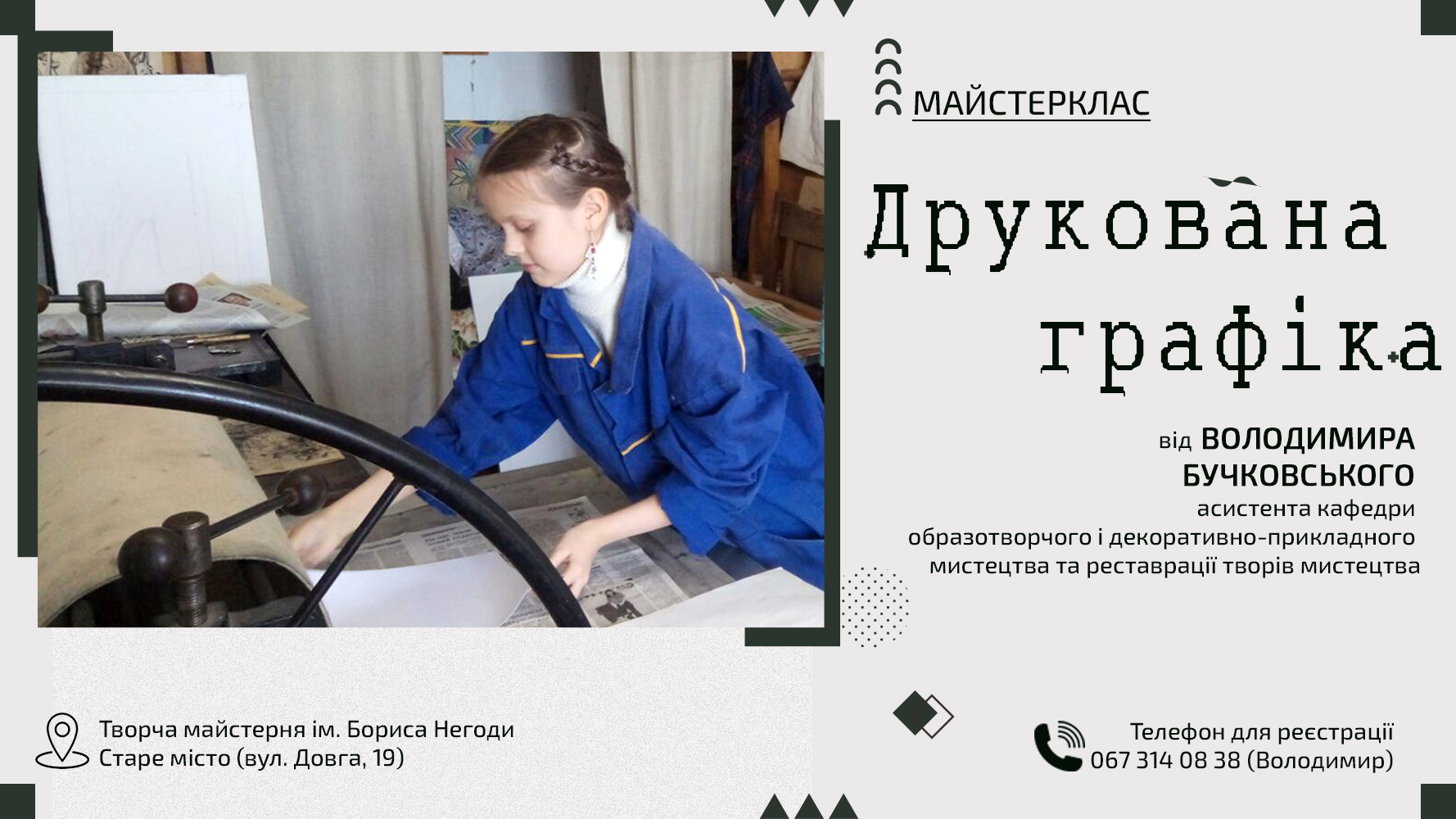 Запрошуємо всіх охочих взяти участь у майстеркласі з друкованої графіки від Володимира Бучковського, асистента кафедри образотворчого і декоративно-прикладного мистецтва та реставрації творів мистецтва.